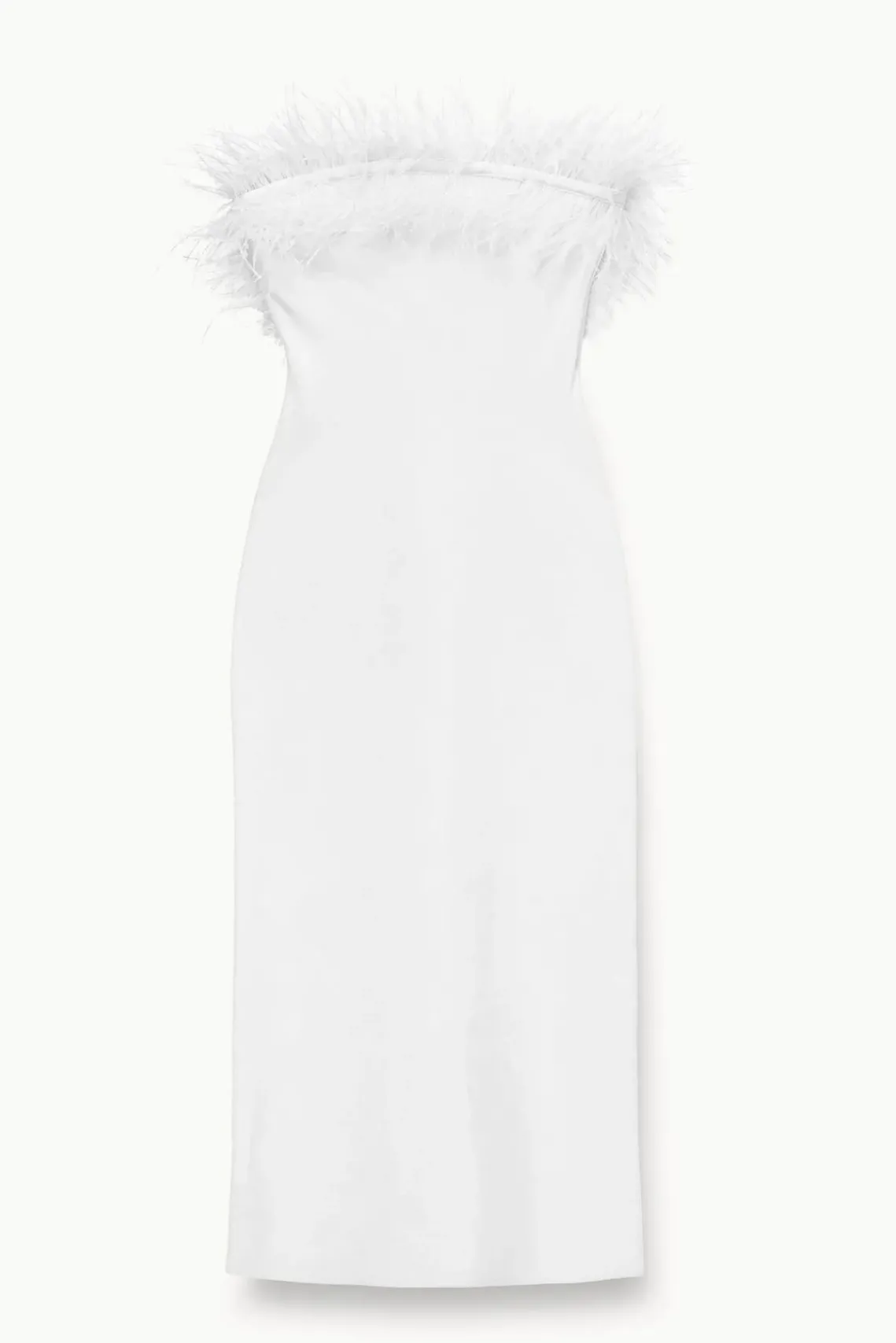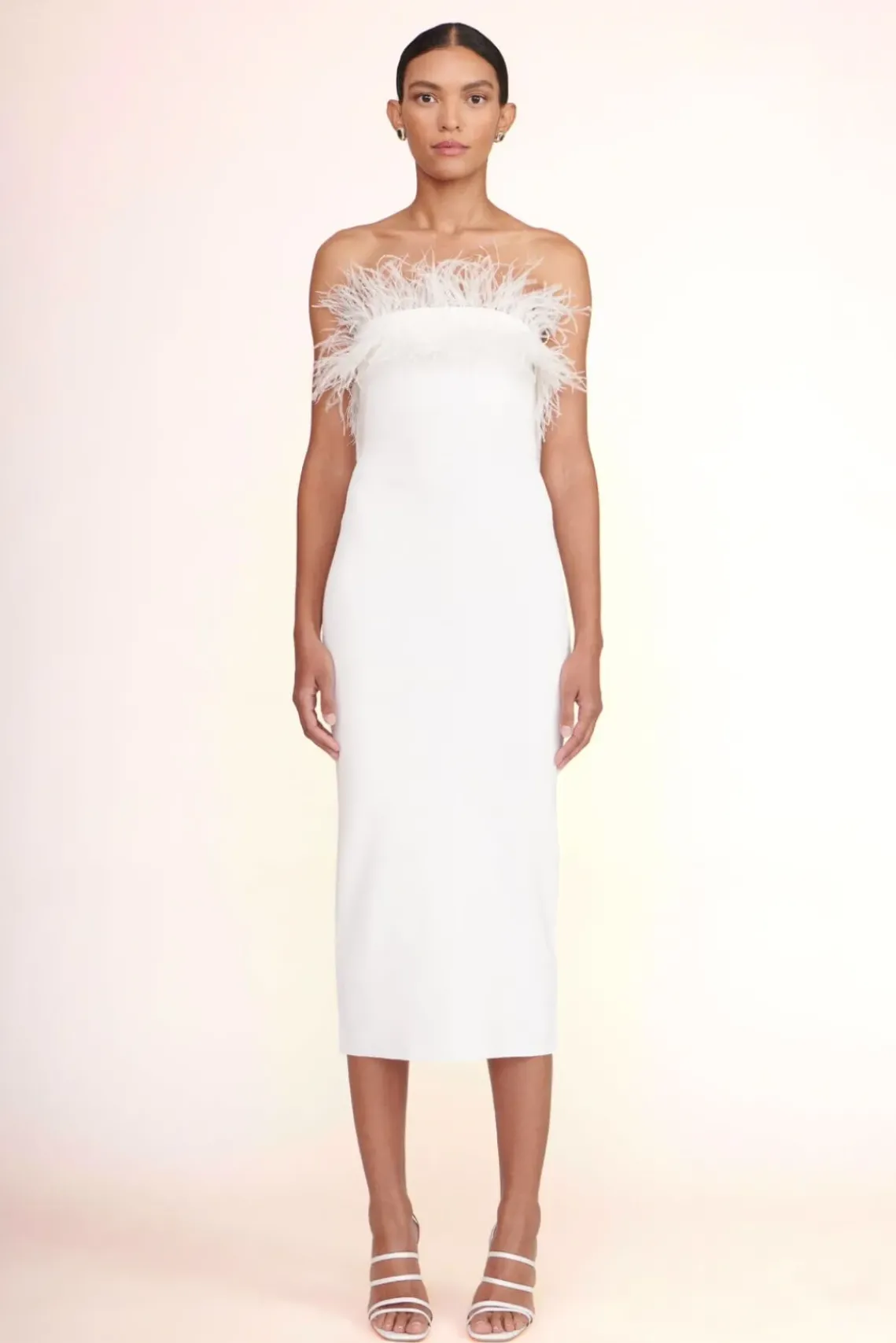 The Nellie Dress is a compact knit fitted midi length dress with ostrich feathers along the bust.