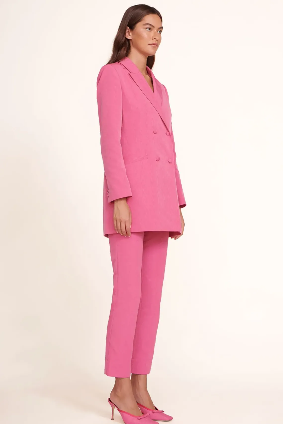An oversized, boxy double breasted blazer made out of a woodgrain-embossed moire fabric. Wear on its own as a dress or over pants.