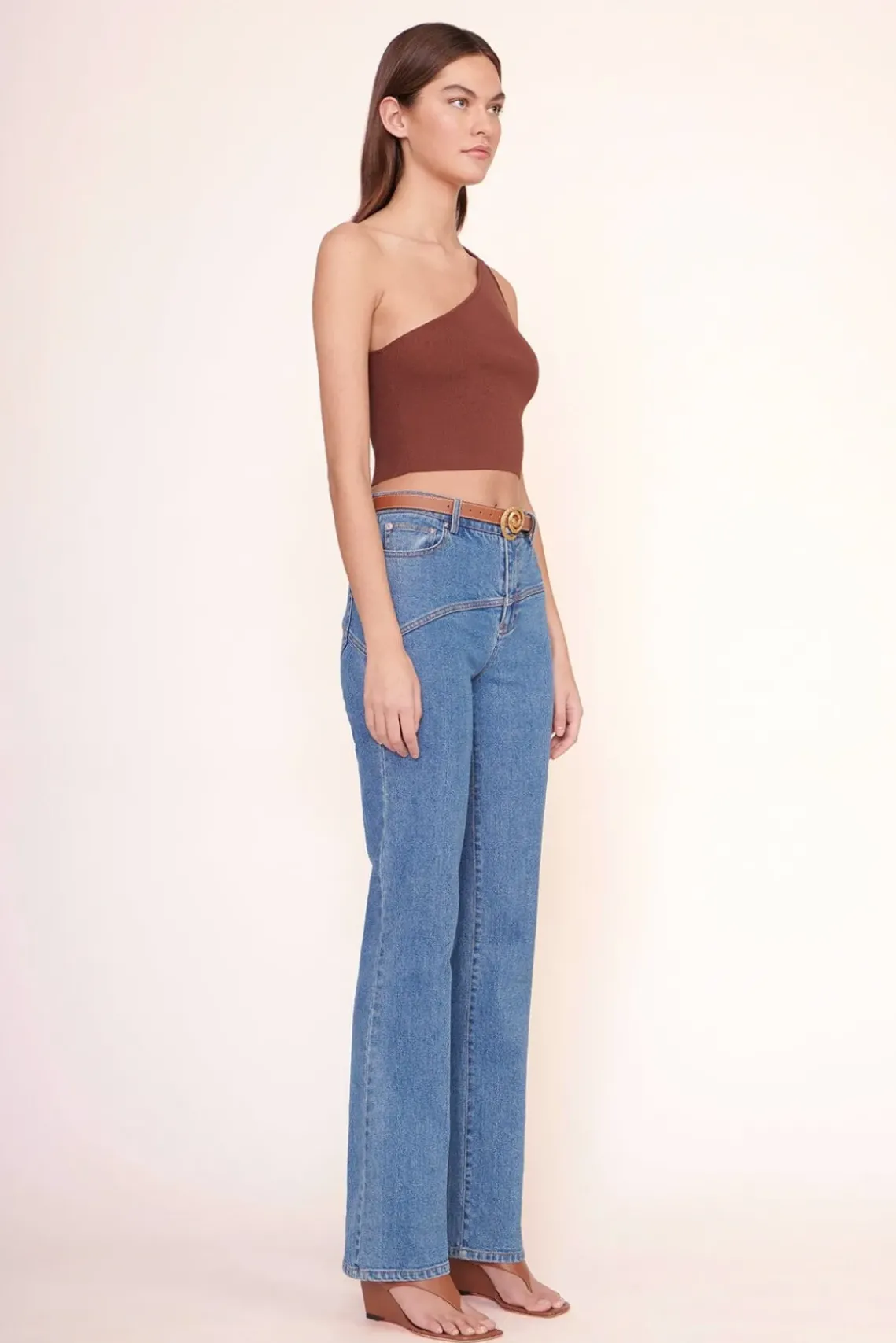 The Lexi is a one shoulder cropped top constructed out of a compact knit fabric.