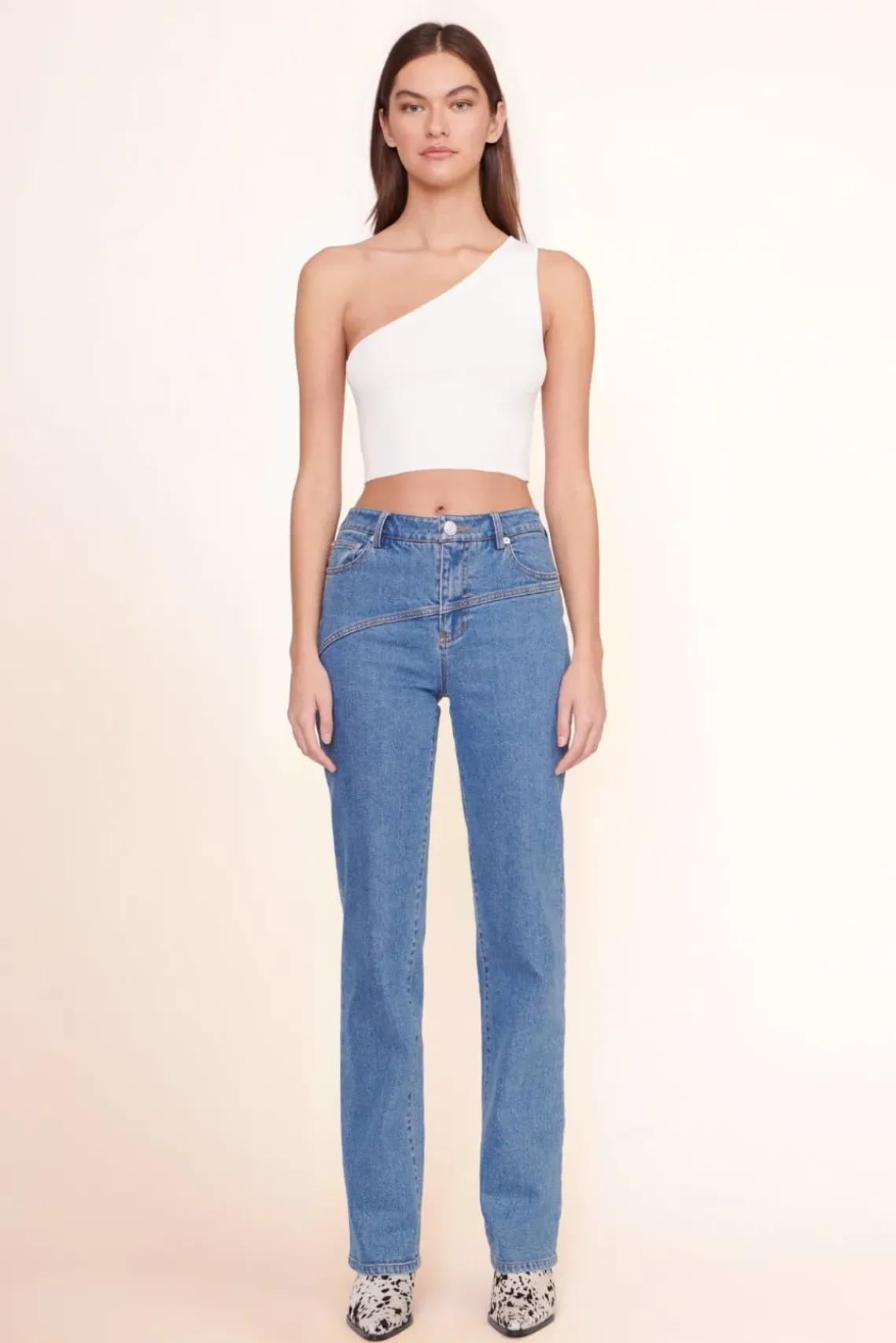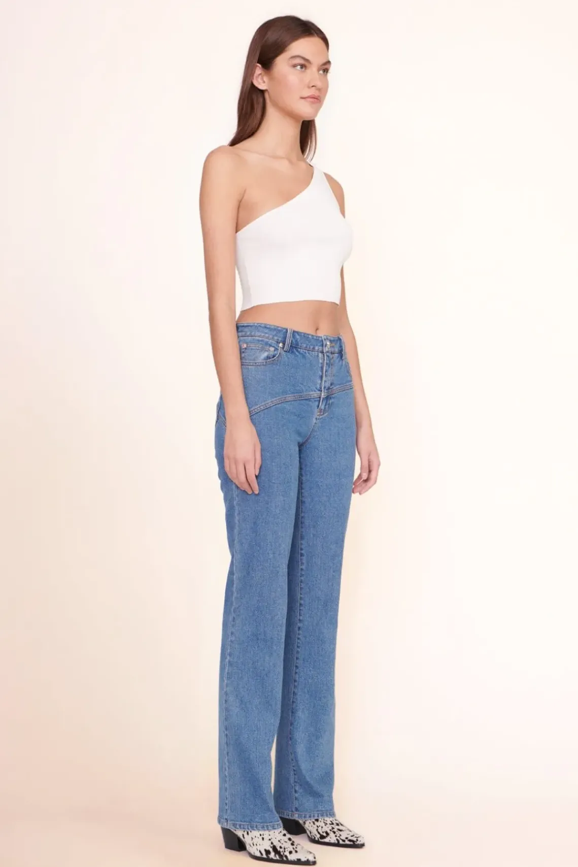 The Lexi is a one shoulder cropped top constructed out of a compact knit fabric.