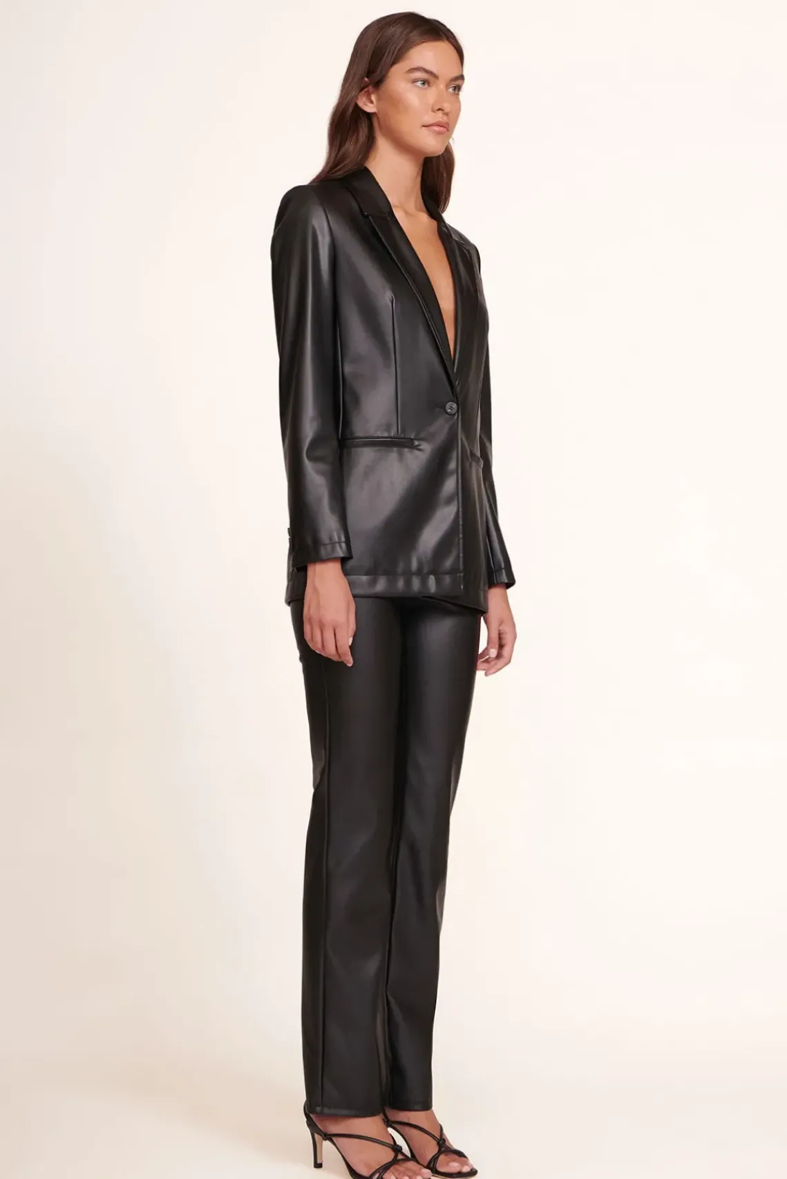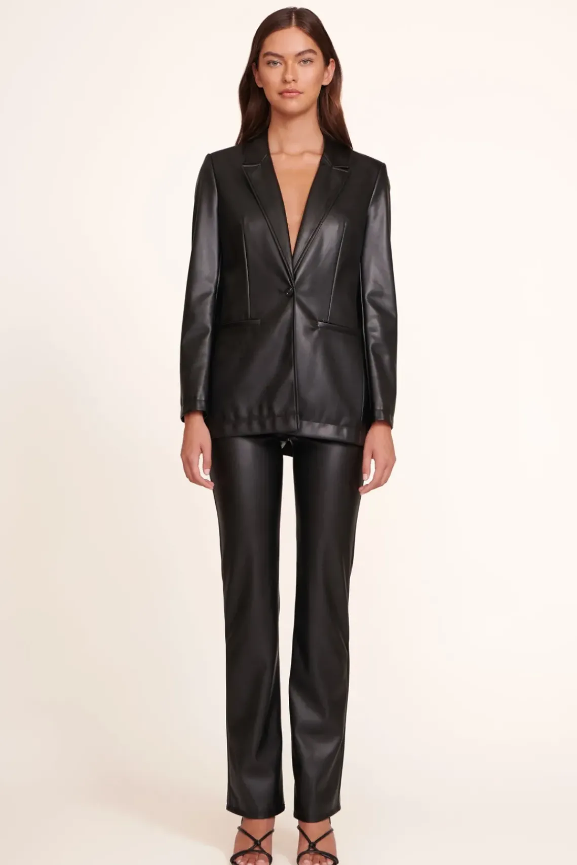 The Vegan Leather Madden Blazer features two front hip pockets with a single button closure.