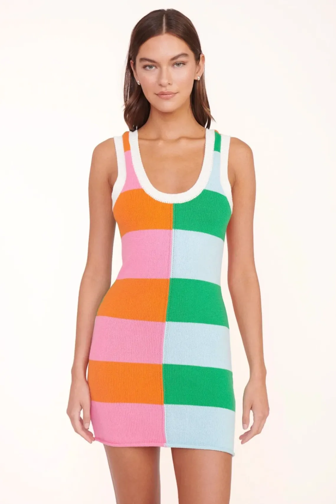The Mini Seashore Dress is a sleeveless, mini-length knit dress with a v neckline. This style features a two-tone, contrasting stripe pattern and contrast trim.