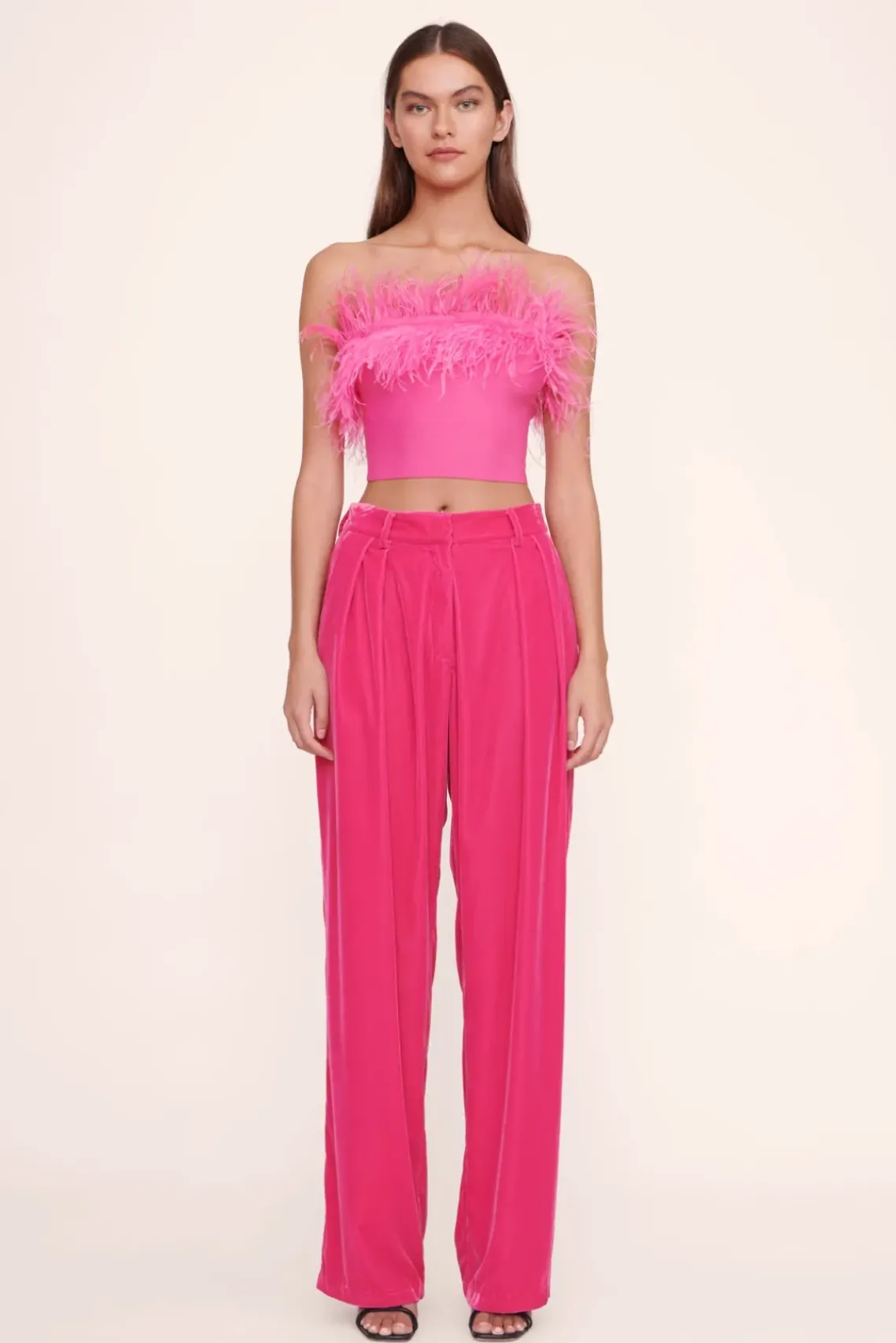 The Nellie top is compact knit tube top with ostrich feathers along the bust. DUE TO THE NATURE OF OSTRICH FEATHERS, SOME COLOR TRANSFER MAY OCCUR