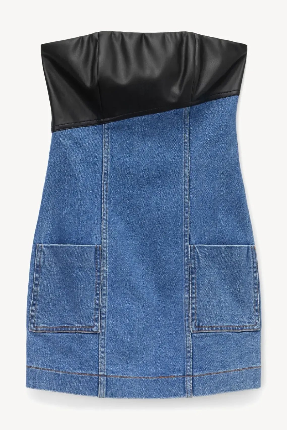 A denim mini tube dress with front pockets, the Serenity Dress features a contrast vegan leather bust panel.