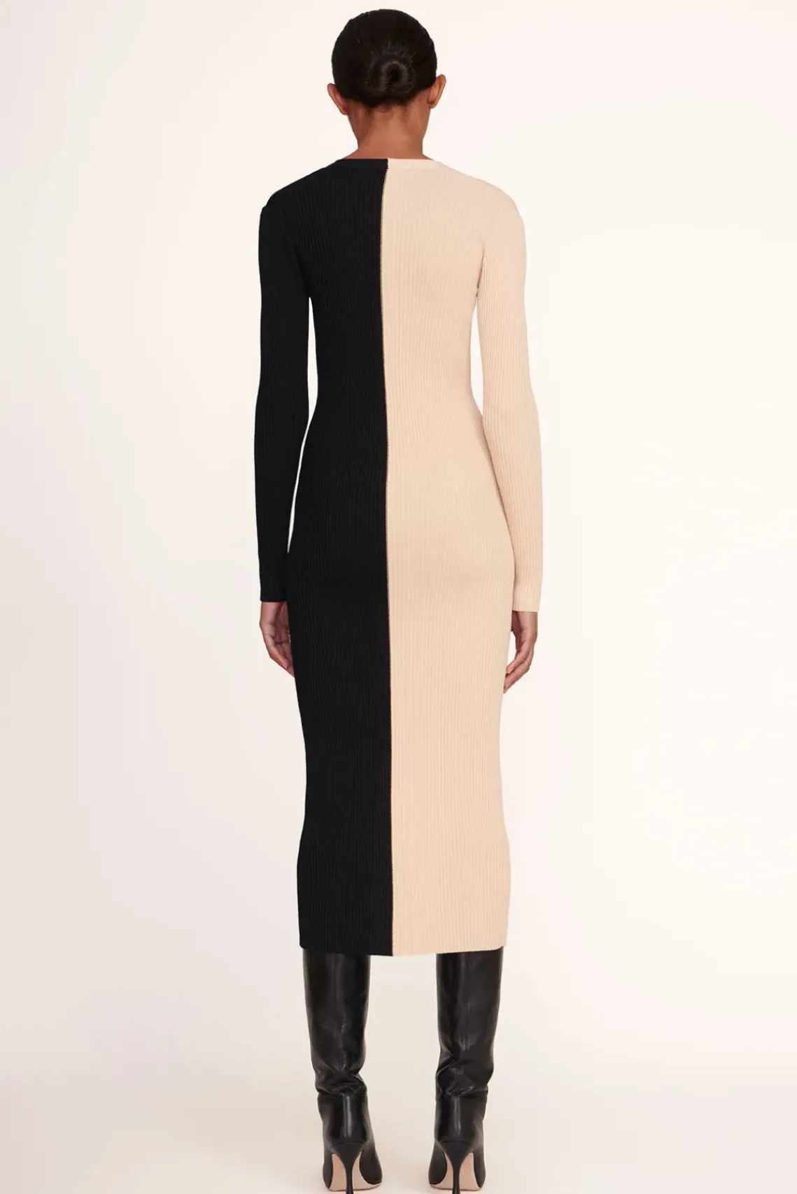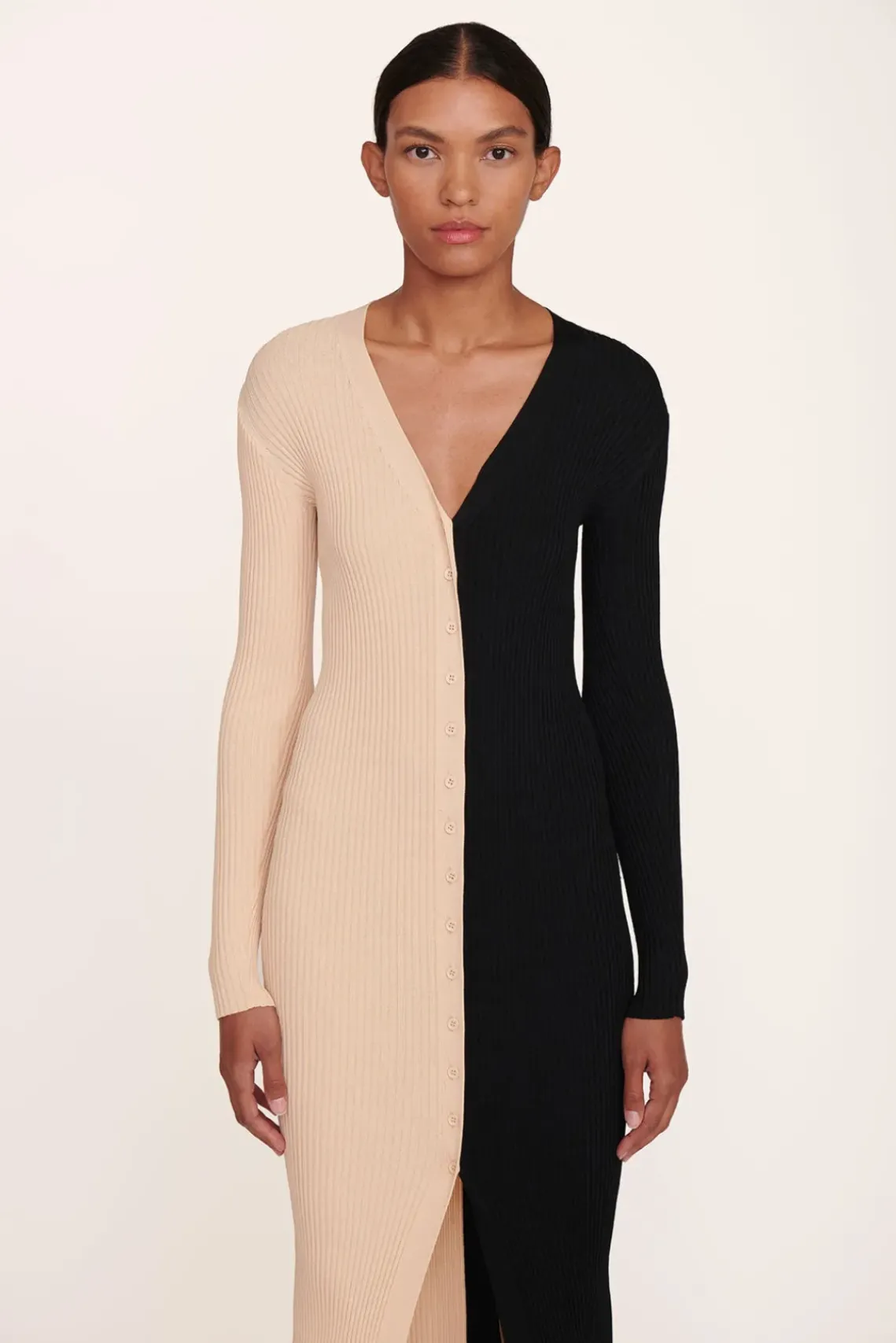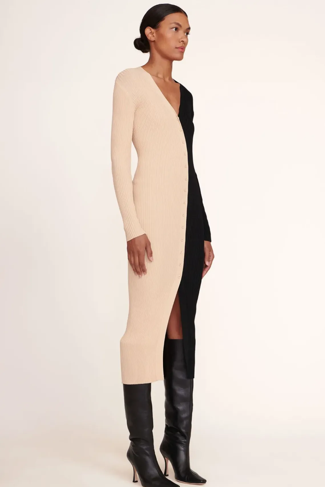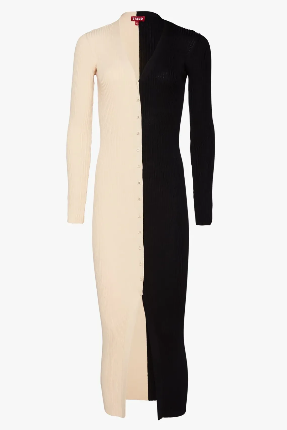 Our signature style, the Shoko Sweater, can be worn as a cardigan or dress. This two-tone style is made out of a stretchy, comfortable compact rib knit fabric
