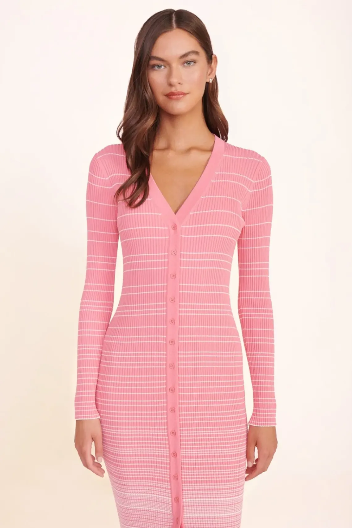 Our signature style in a new ombre stripe update. The Shoko Sweater can be worn as a cardigan or dress. This style is made out of a stretchy, comfortable compact rib knit fabric