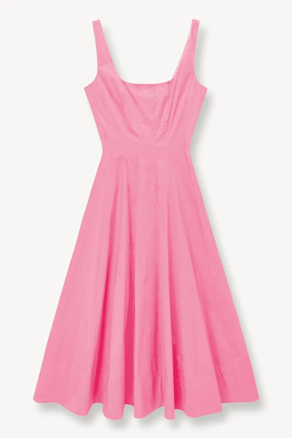 The Wells Dress features a corset-style panel construction to create a flattering, fitted shape through the waist and a midi length a-line skirt. Made out of lightweight cotton poplin.