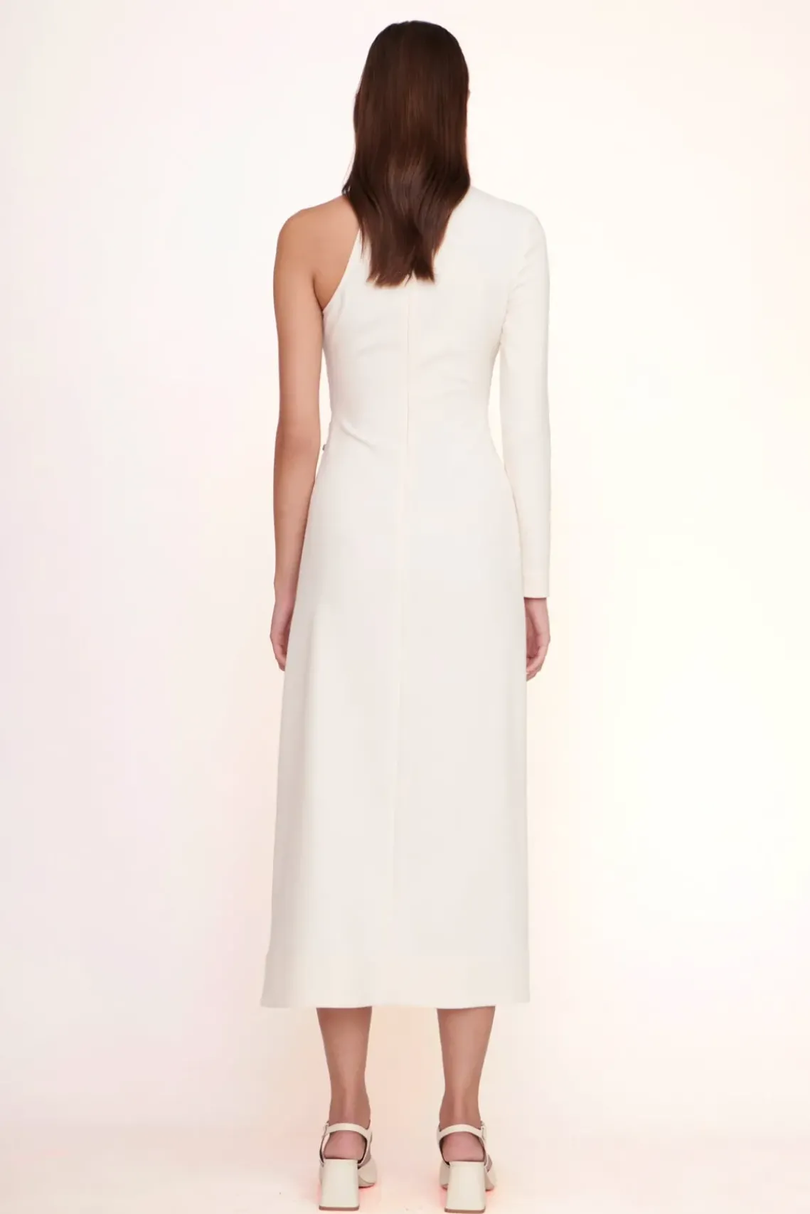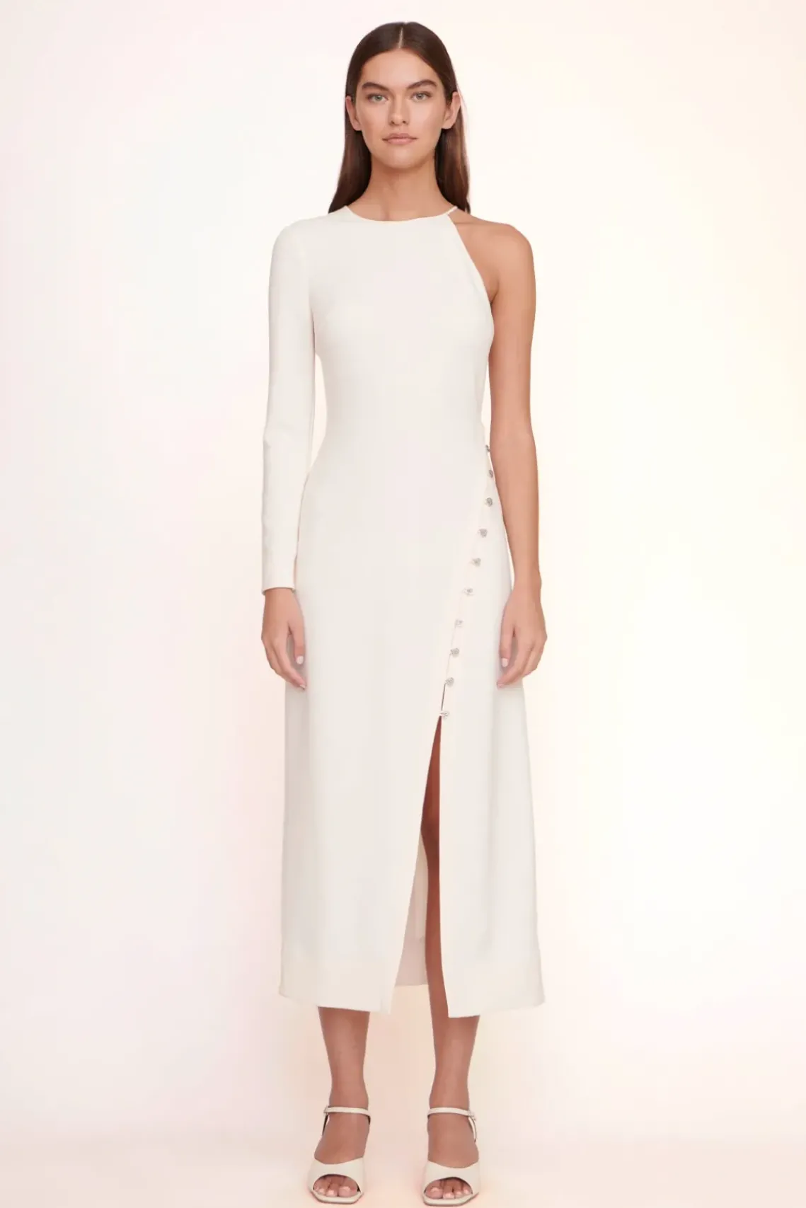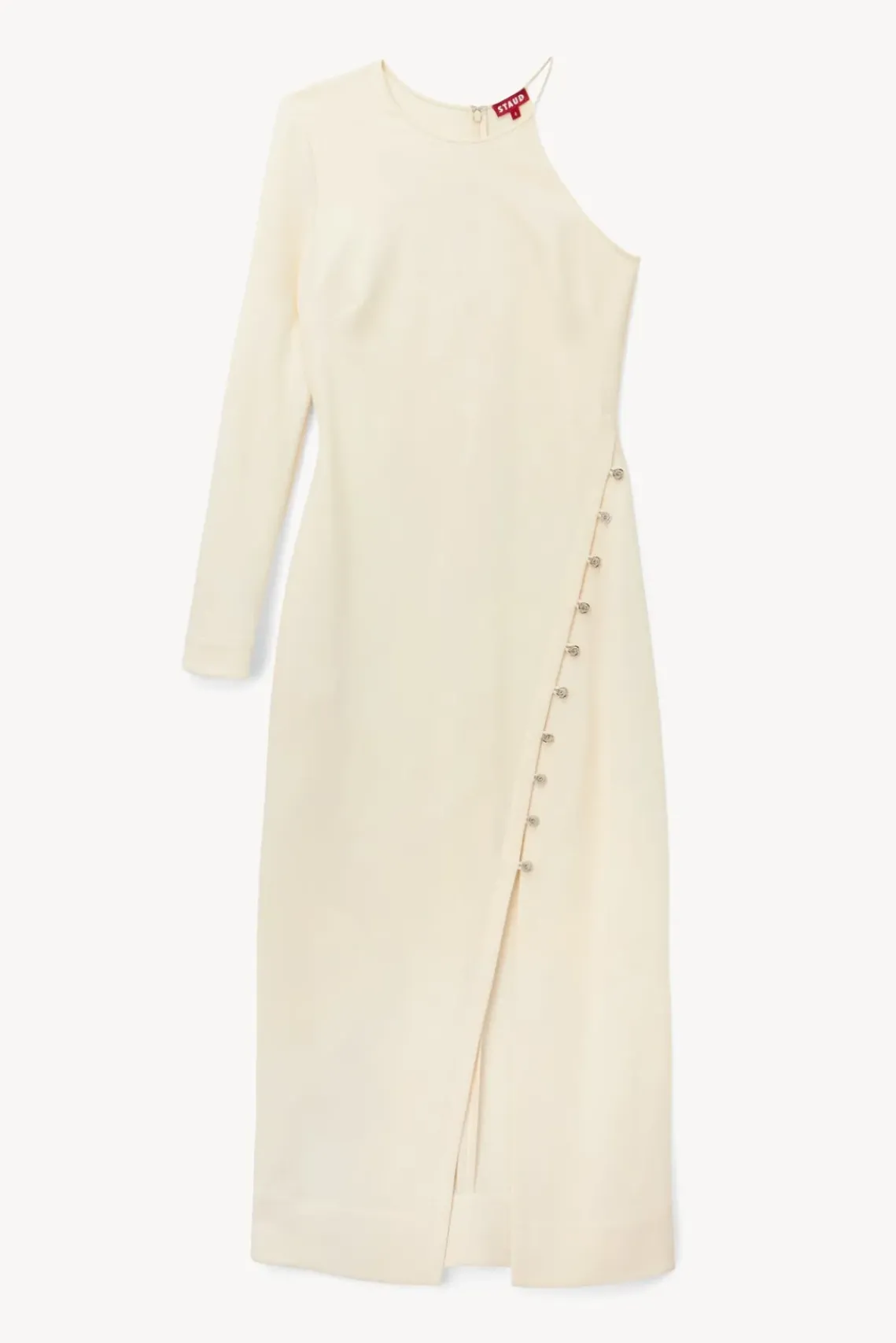 The Zhuri Tunic is a midi one sleeve crepe tunic with a functional asymmetrical placket. This dress features small swirl buttons that are aligned from the hip to the leg.