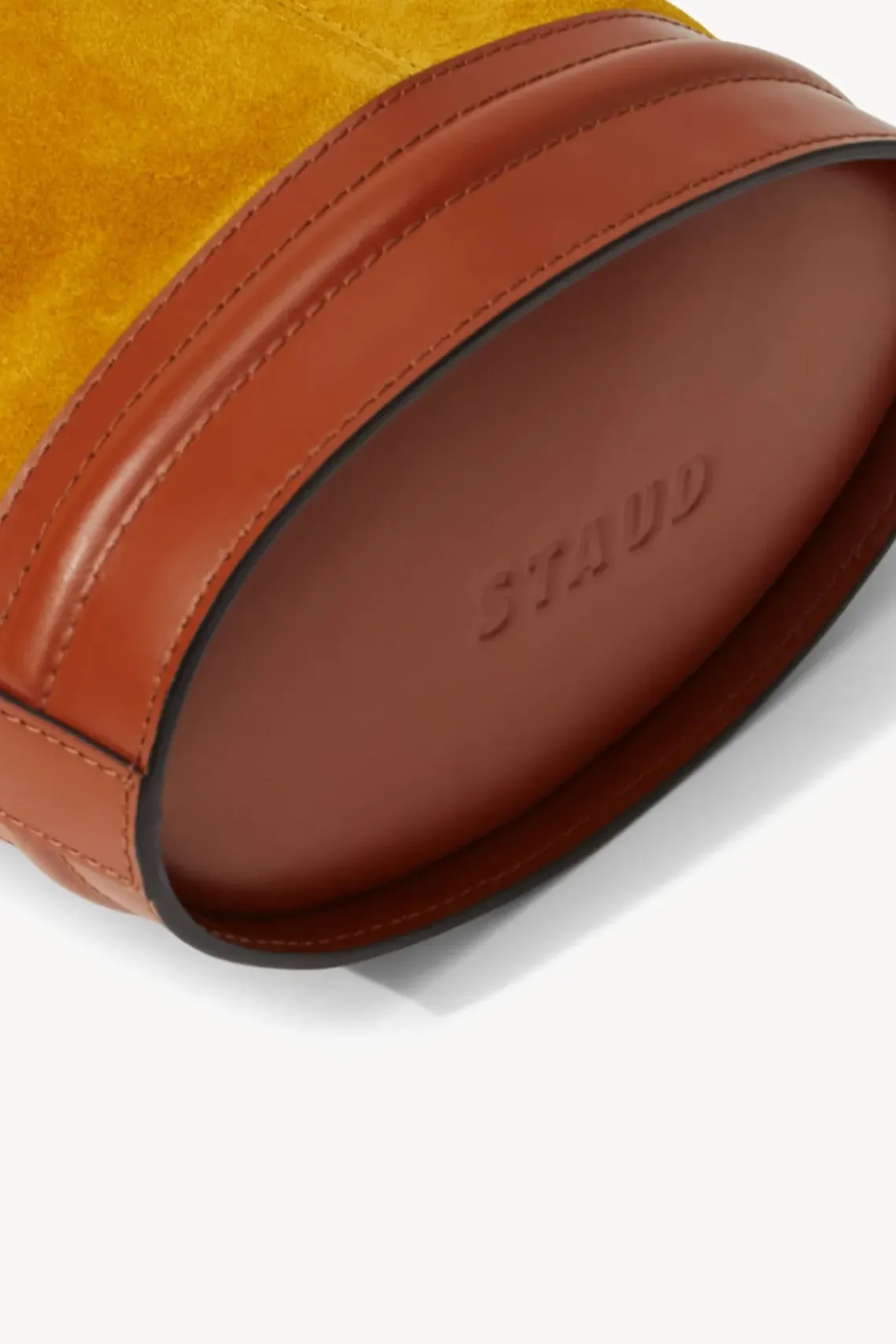The Anita is a suede bucket bag with leather base and strap. This style features an interior linen lining and leather knotting.
