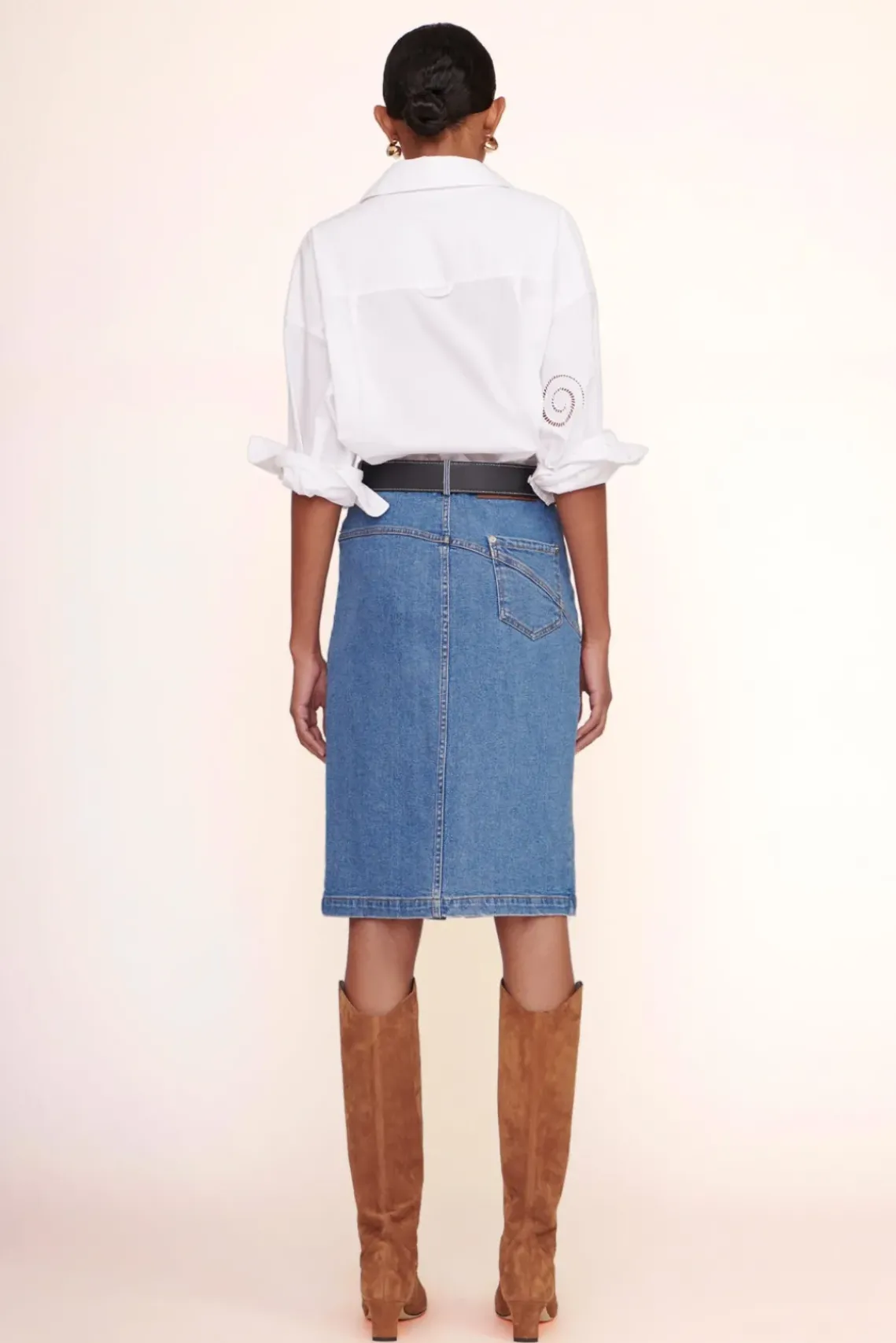 A 45mm leather belt with contrast top stitch. This style features a hammered prong buckle with swirl motif that matches our ready to wear collection.