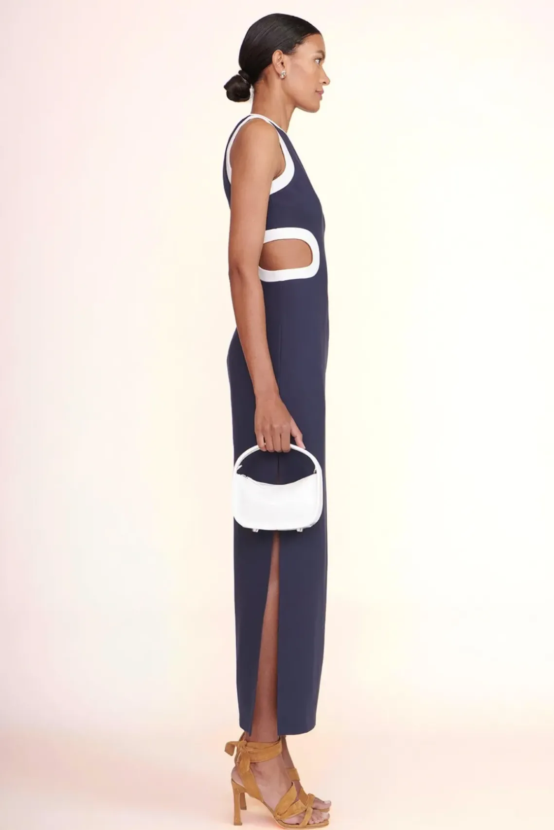 A new soft crescent shape, the Venice Bag features binding construction, a removable crossbody strap and zipper closure.