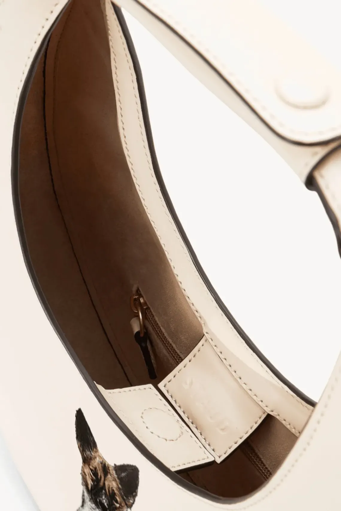 Please allow 5-8 weeks once your order has been placed for us to fulfill and ship. Personalize your handbag with a hand-painted portrait of your pet. The Moon Bag features a curved handle with a removable STAUD embossed accent. Designed in a crescent moon shape with inner suede lining and a magnetic clasp closure to ho