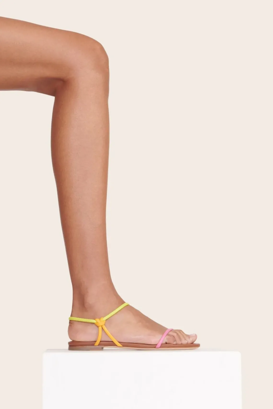A flat sandal with multi-colored tubular straps, the Laurel Sandal features a leather cord toe and ankle strap.