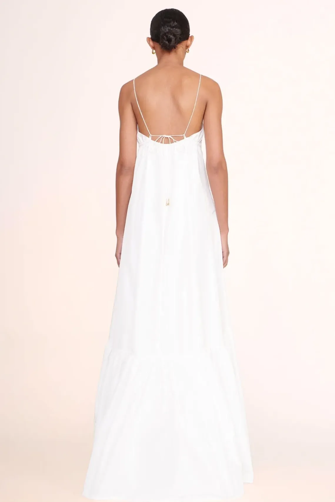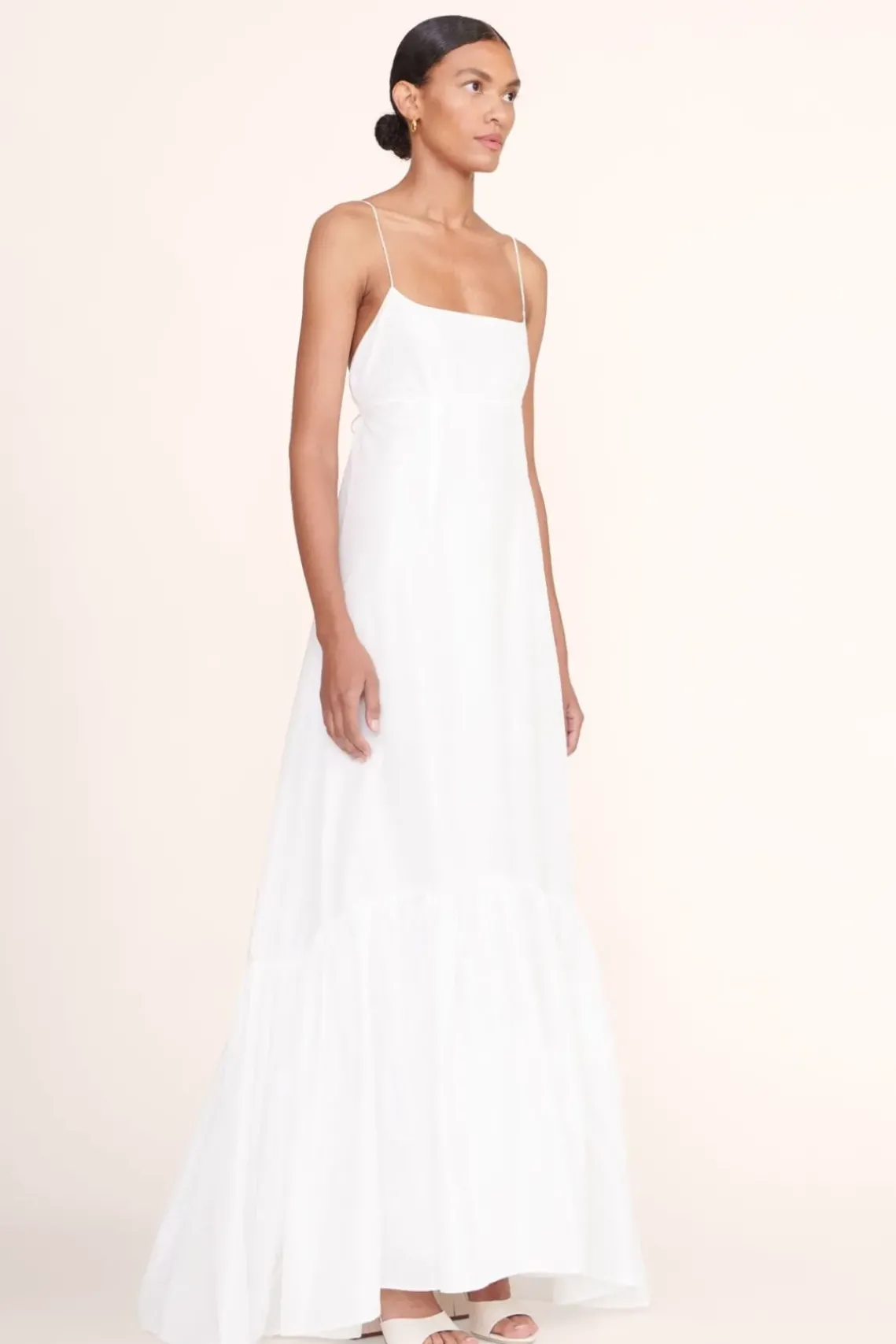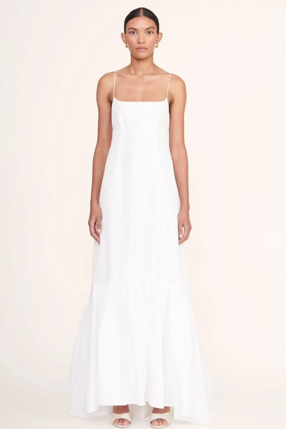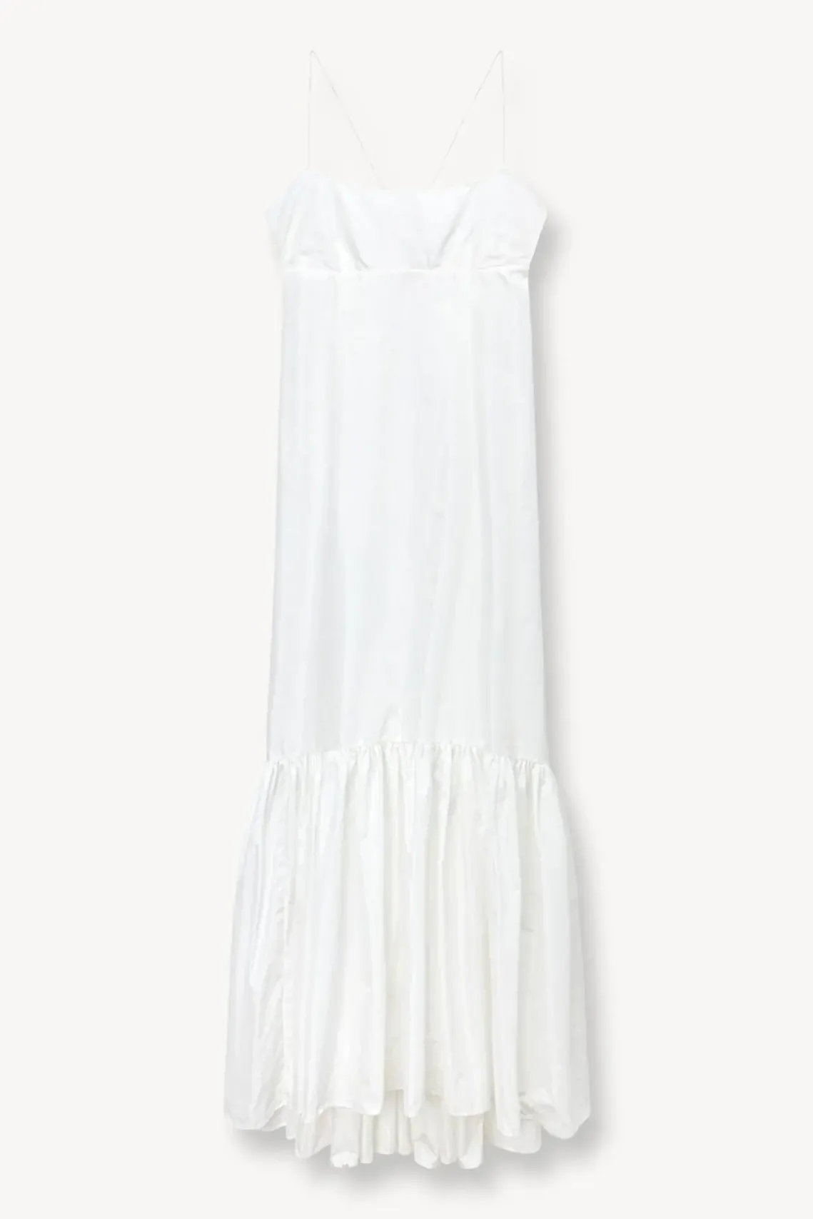 A full length gown made out of taffeta. The Florence Dress features thin spaghetti straps and a tall tier hem.