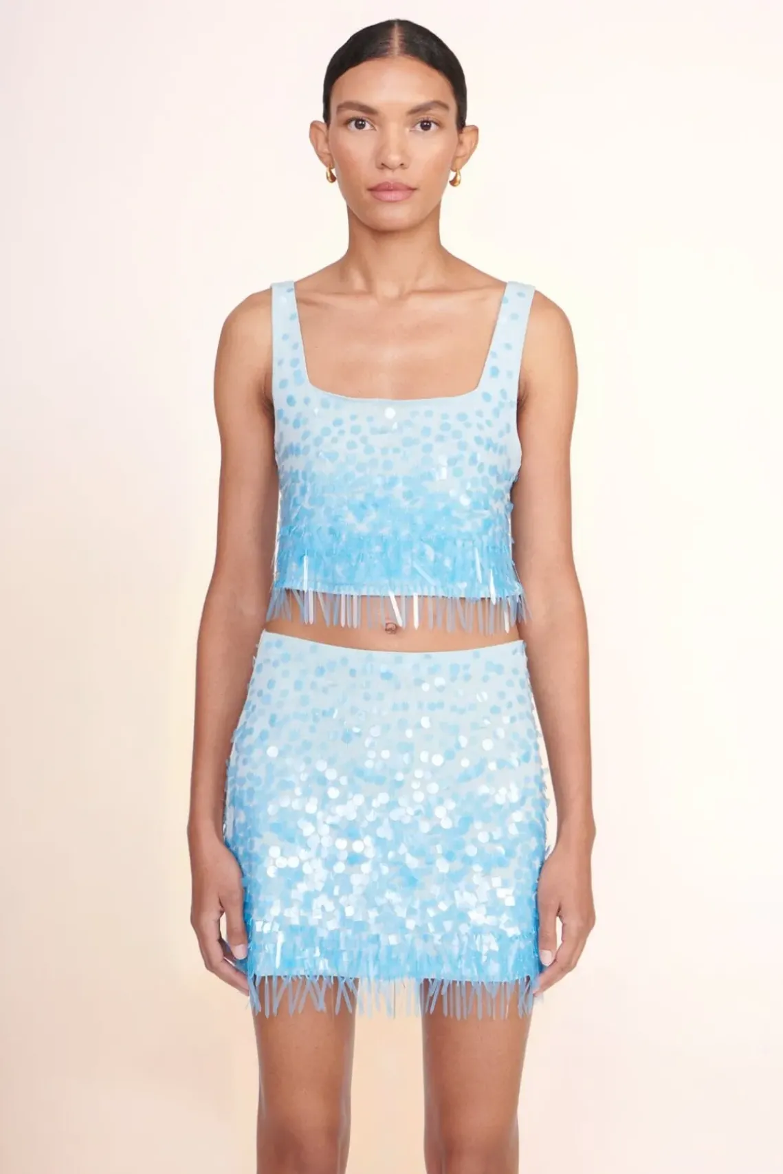 The Rebecca Skirt is an all-over embellished paillette mini skirt with paillette fringe at the hem. This style features a hidden side zipper and makes a matching set with the Jasmin Top.