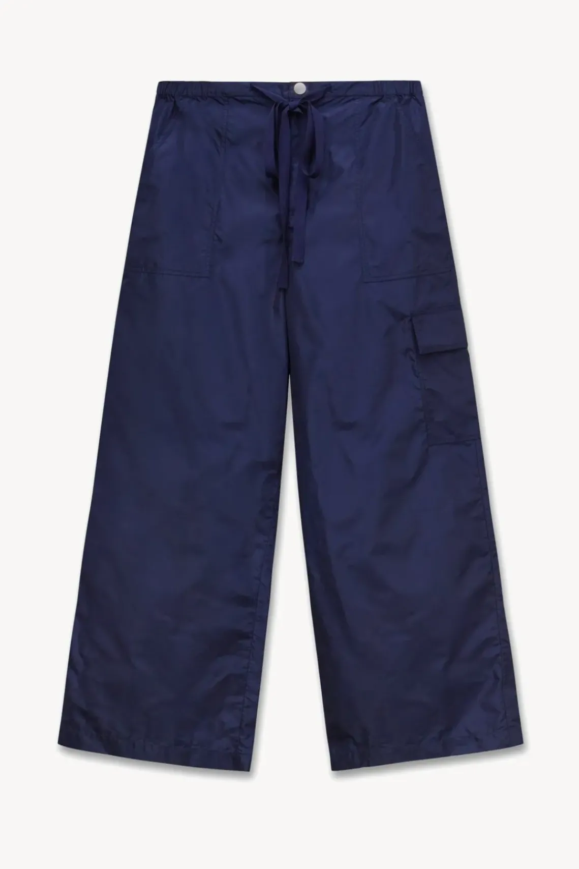 The Camila is a wide leg, low rise cargo pant made out of taffeta. This style features an adjustable waist tie and cargo pockets.