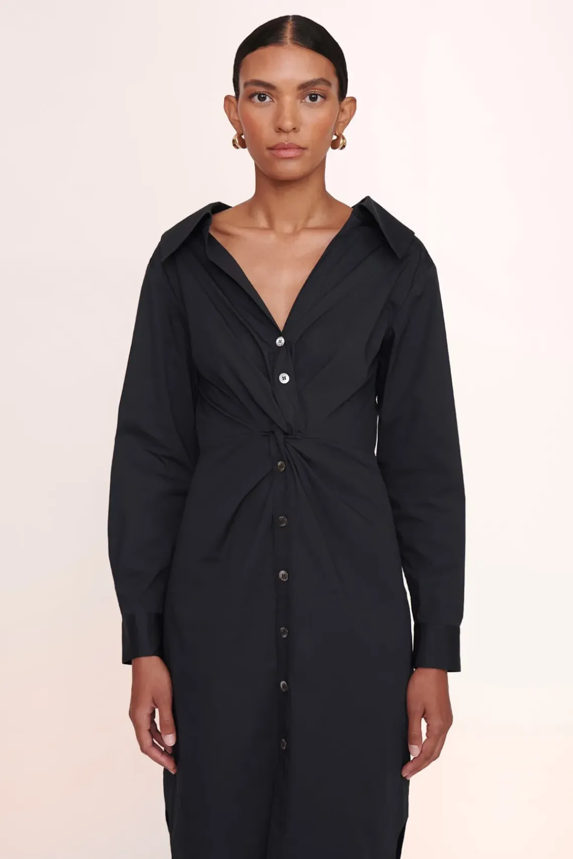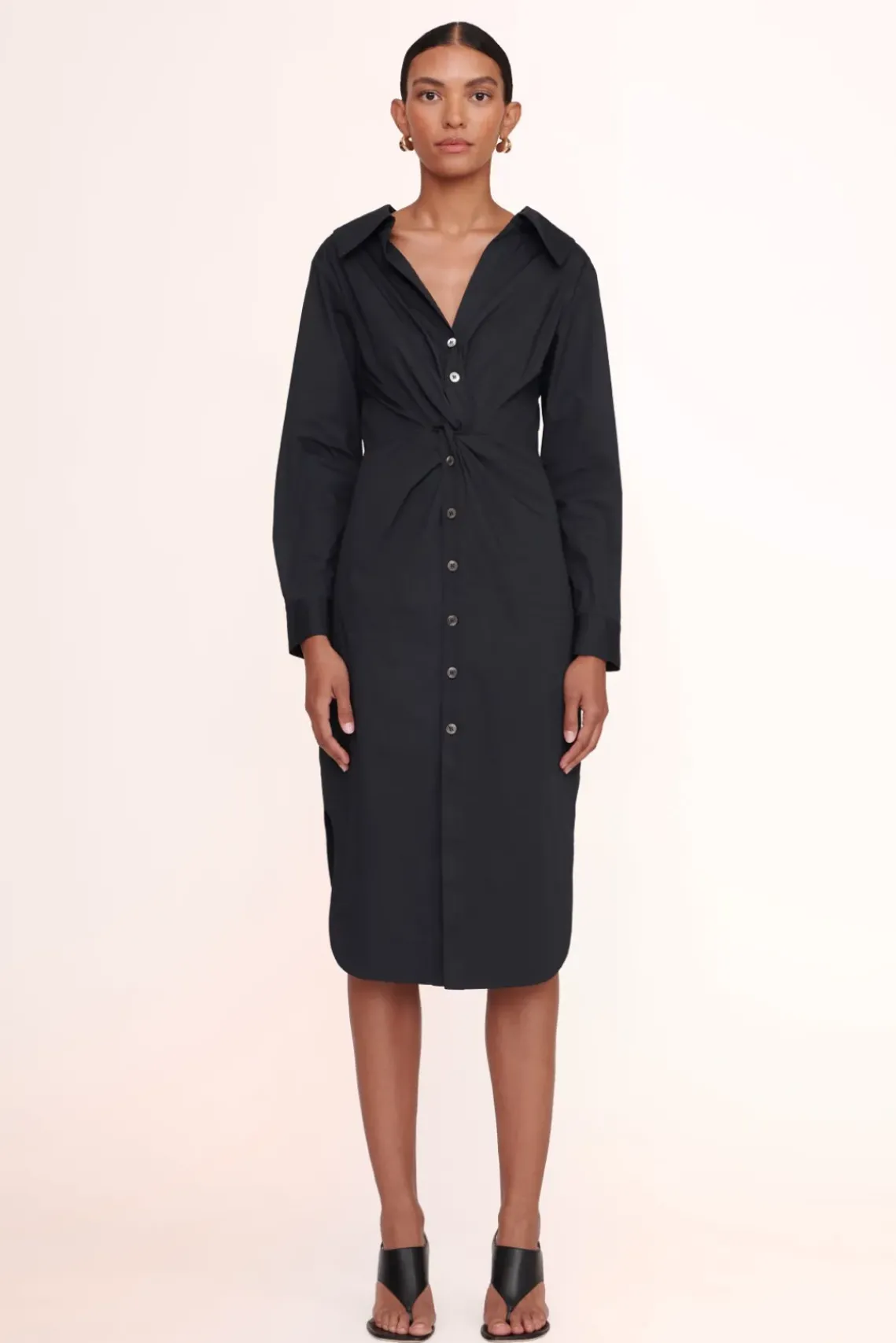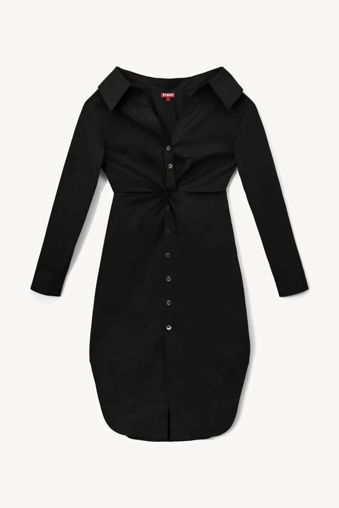 The Clea is a cotton poplin midi-length shirt dress with twist detail. This style features a curved shirt tail hem and slightly open neckline.