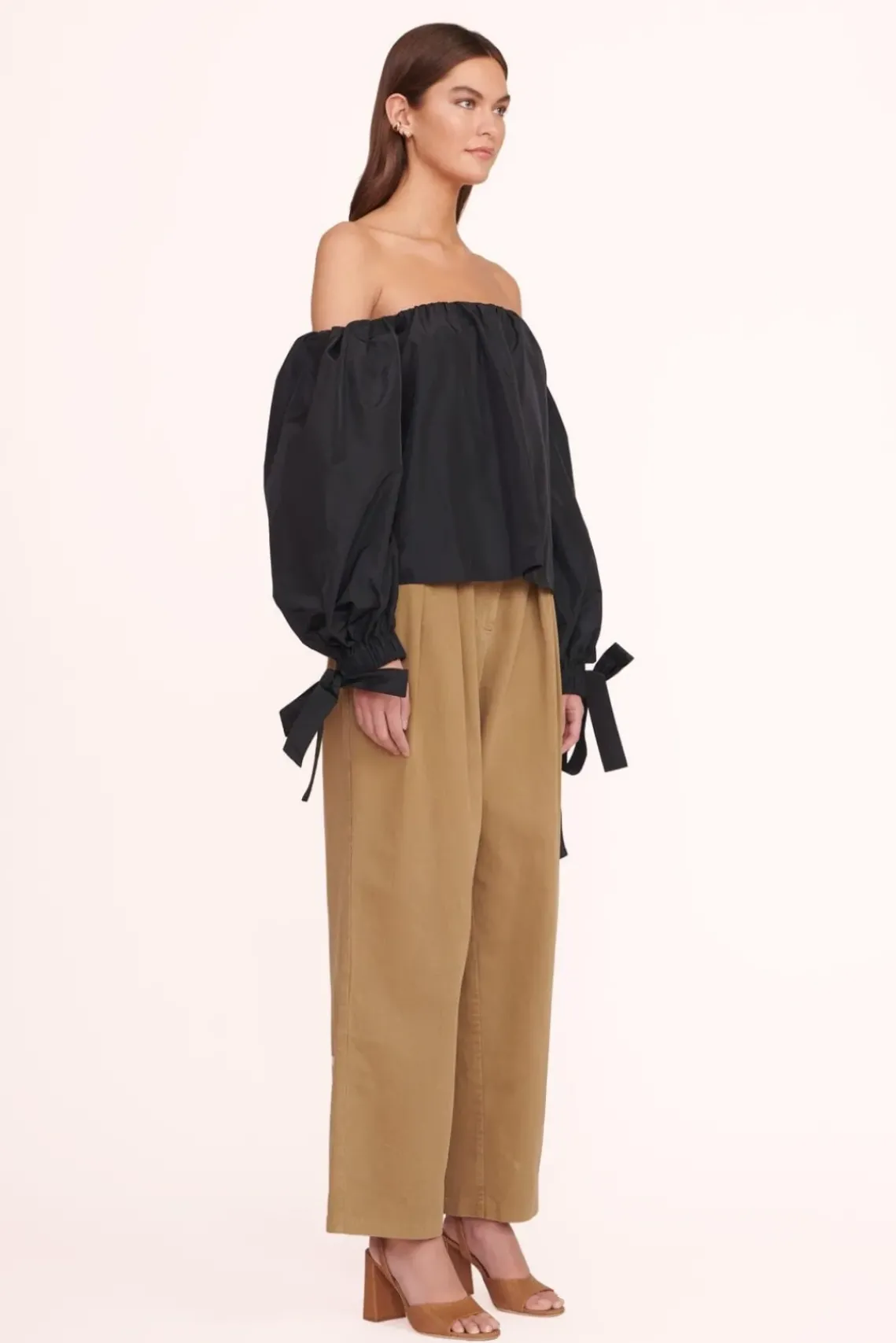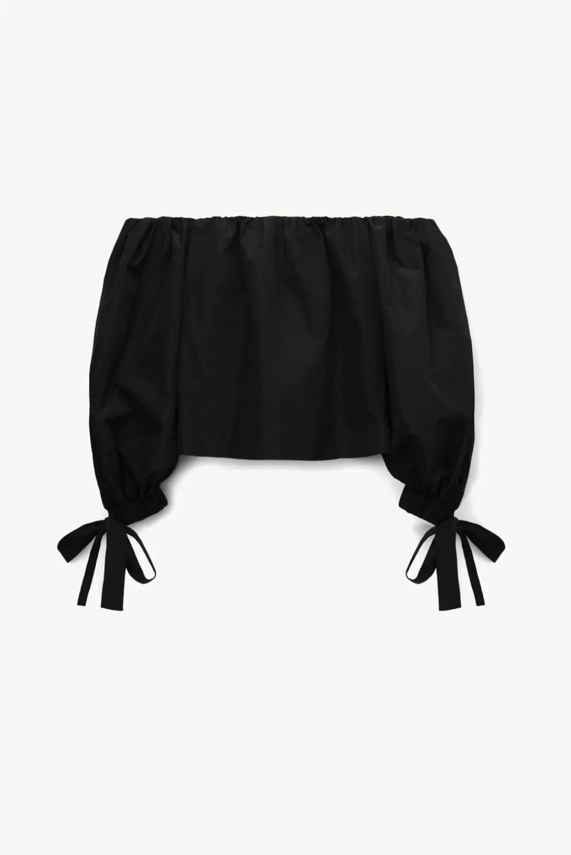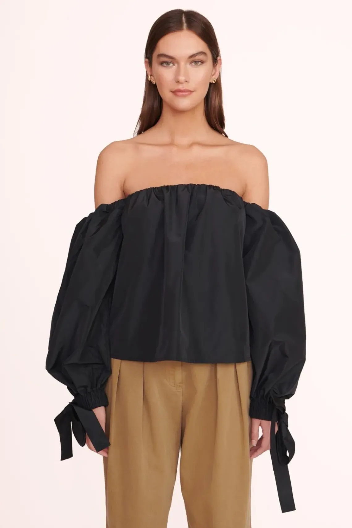 An off-the-shoulder taffeta top, the Colby features tie details at the sleeve hems.
