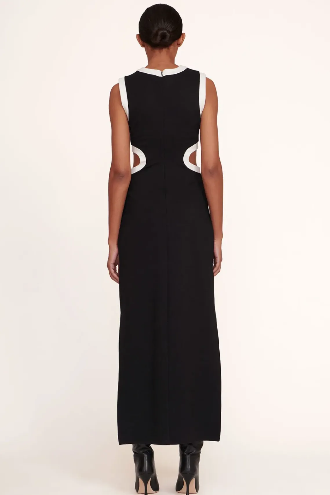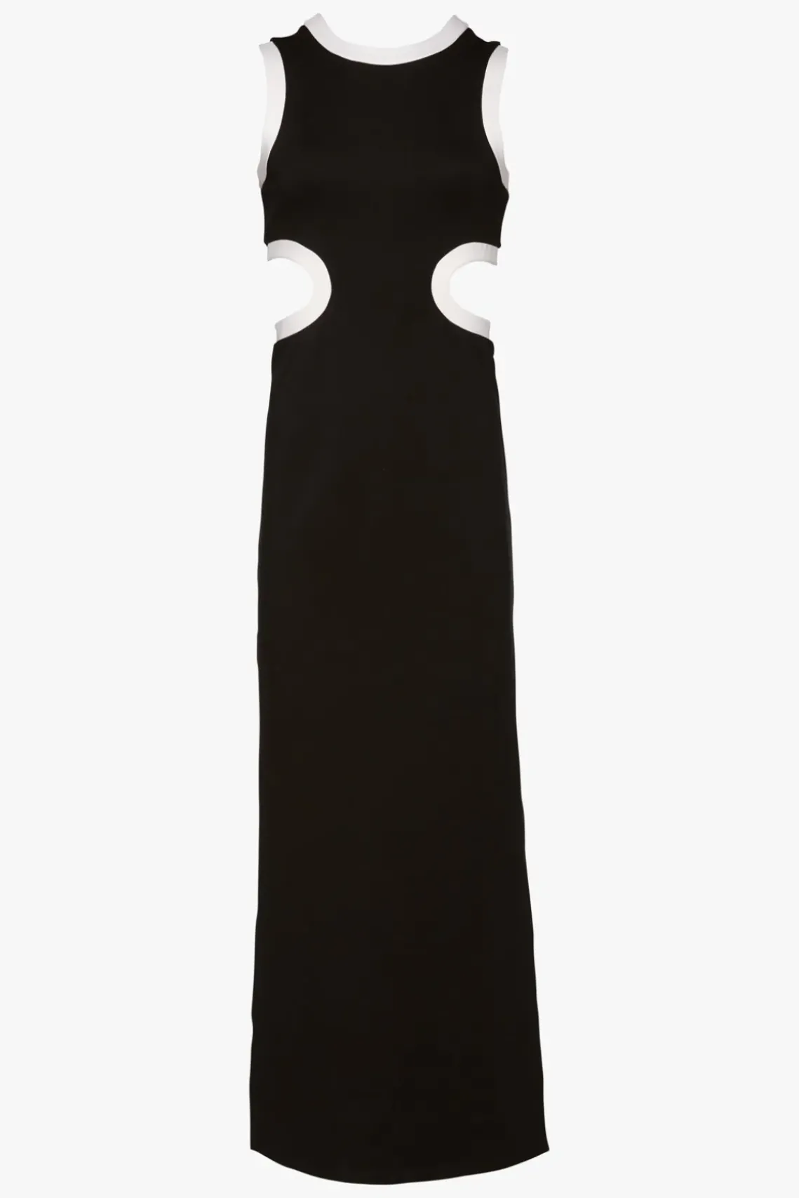 The Dolce Dress is a full length, sleeveless ponte dress. This style features cutouts at the waist, side slits, back zipper closure and contrasting trim.