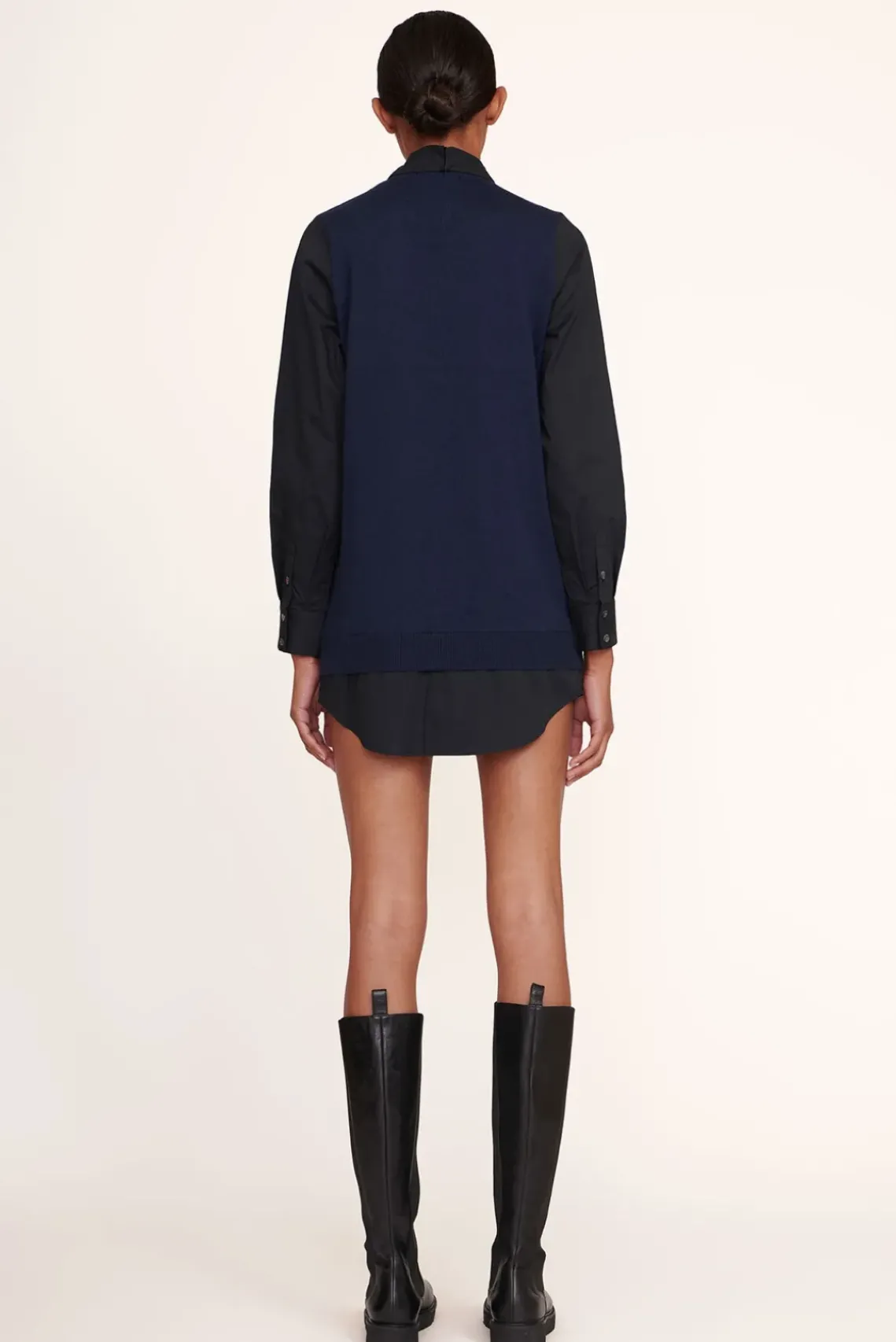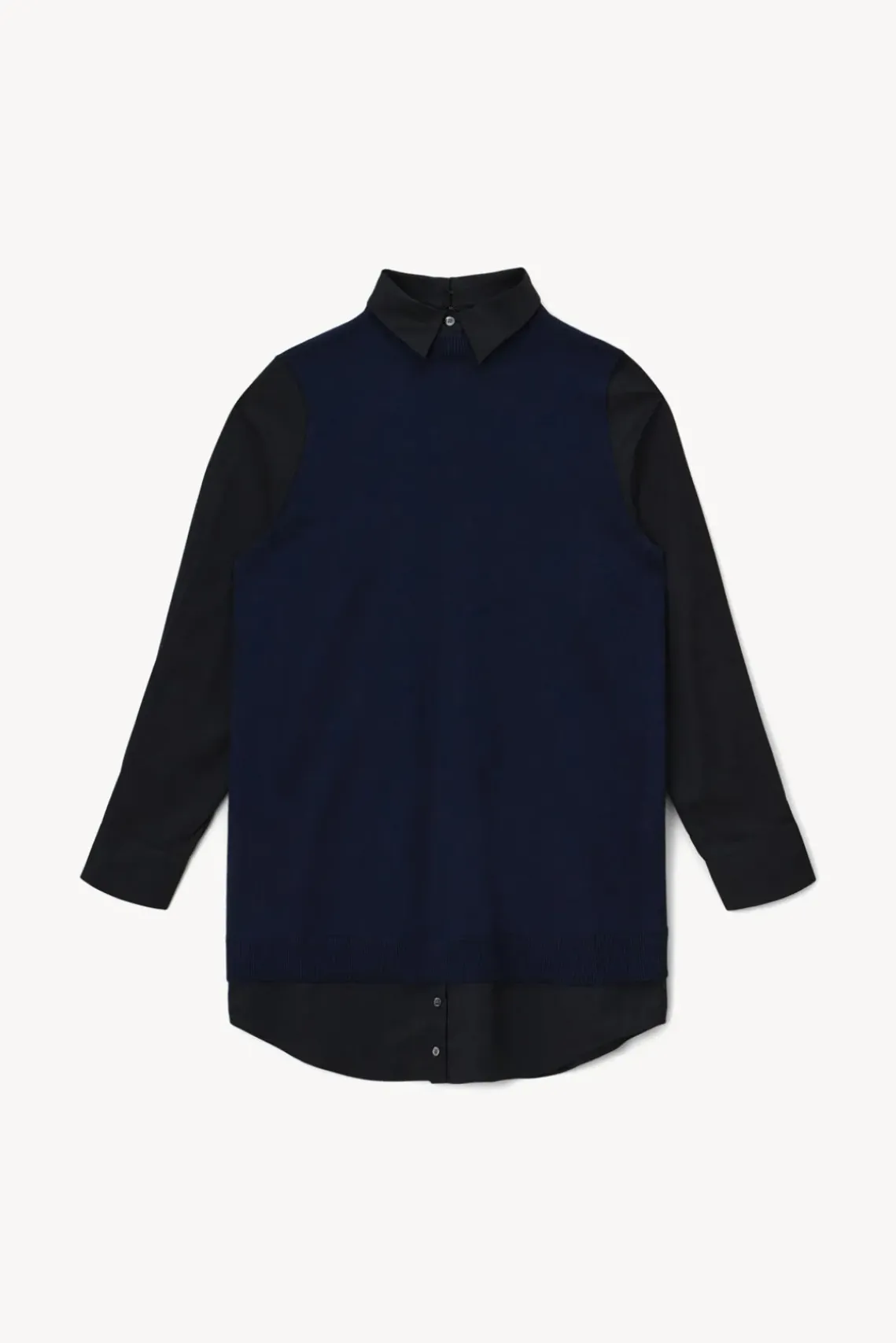 The Fern Dress is a knit mini dress with long woven sleeves, shirttail hem and a detachable collar.