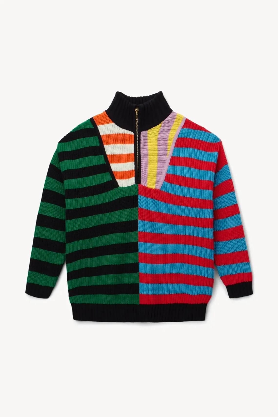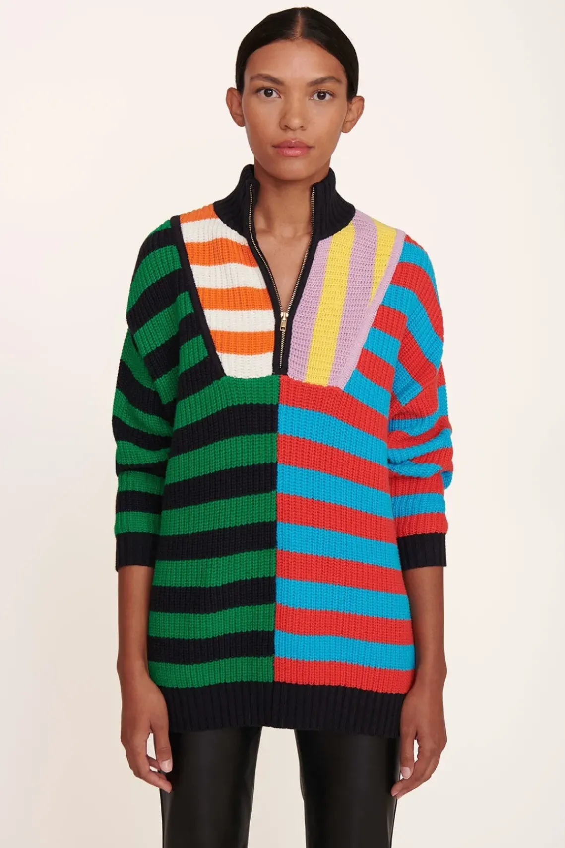 Our chunky cotton knit Hampton Sweater is an oversized boyfriend-style sweater in a bright, colorful stripe pattern. This style features a half-zip detail at the front.