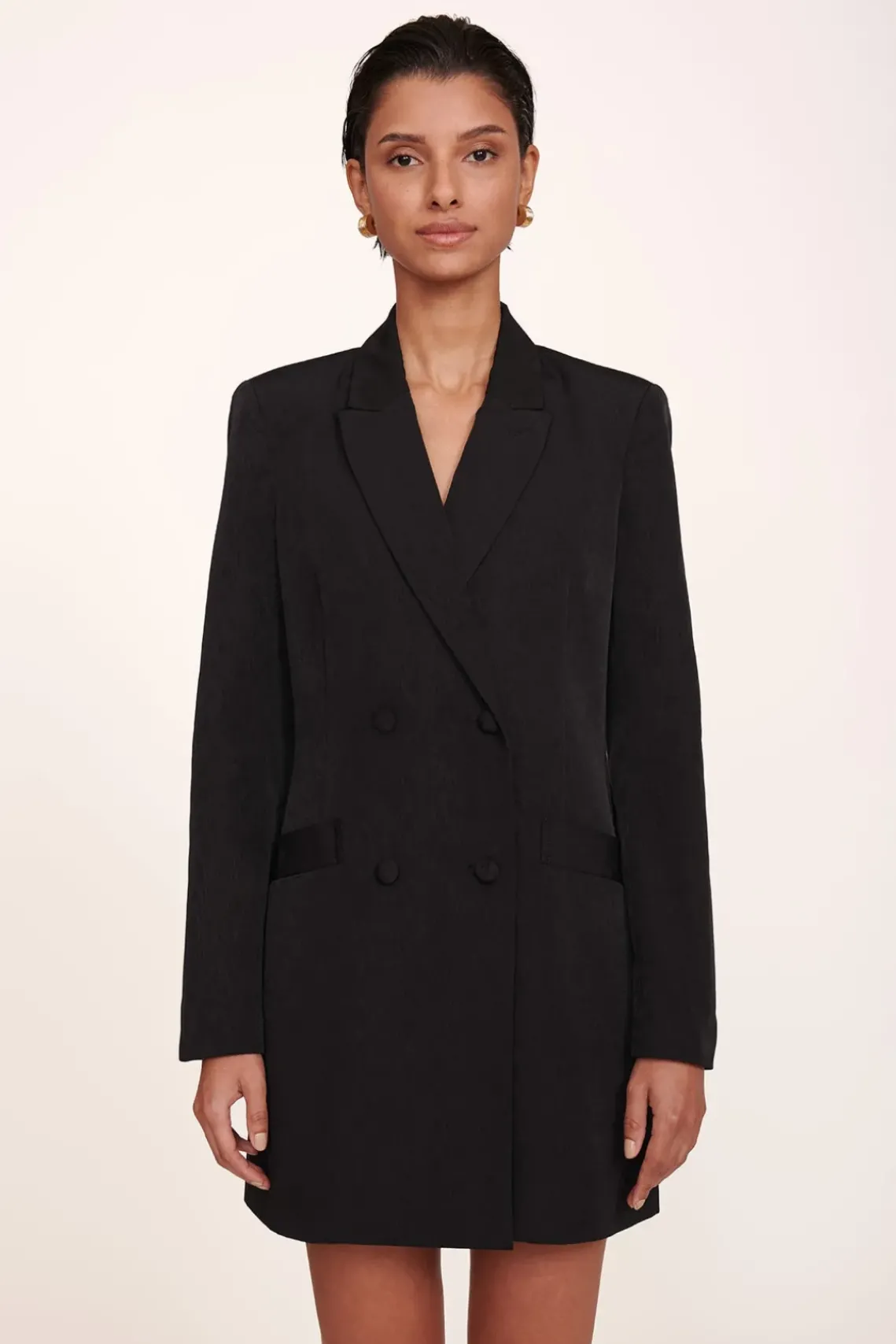 An oversized, boxy double breasted blazer made out of a woodgrain-embossed moire fabric. Wear on its own as a dress or over pants.