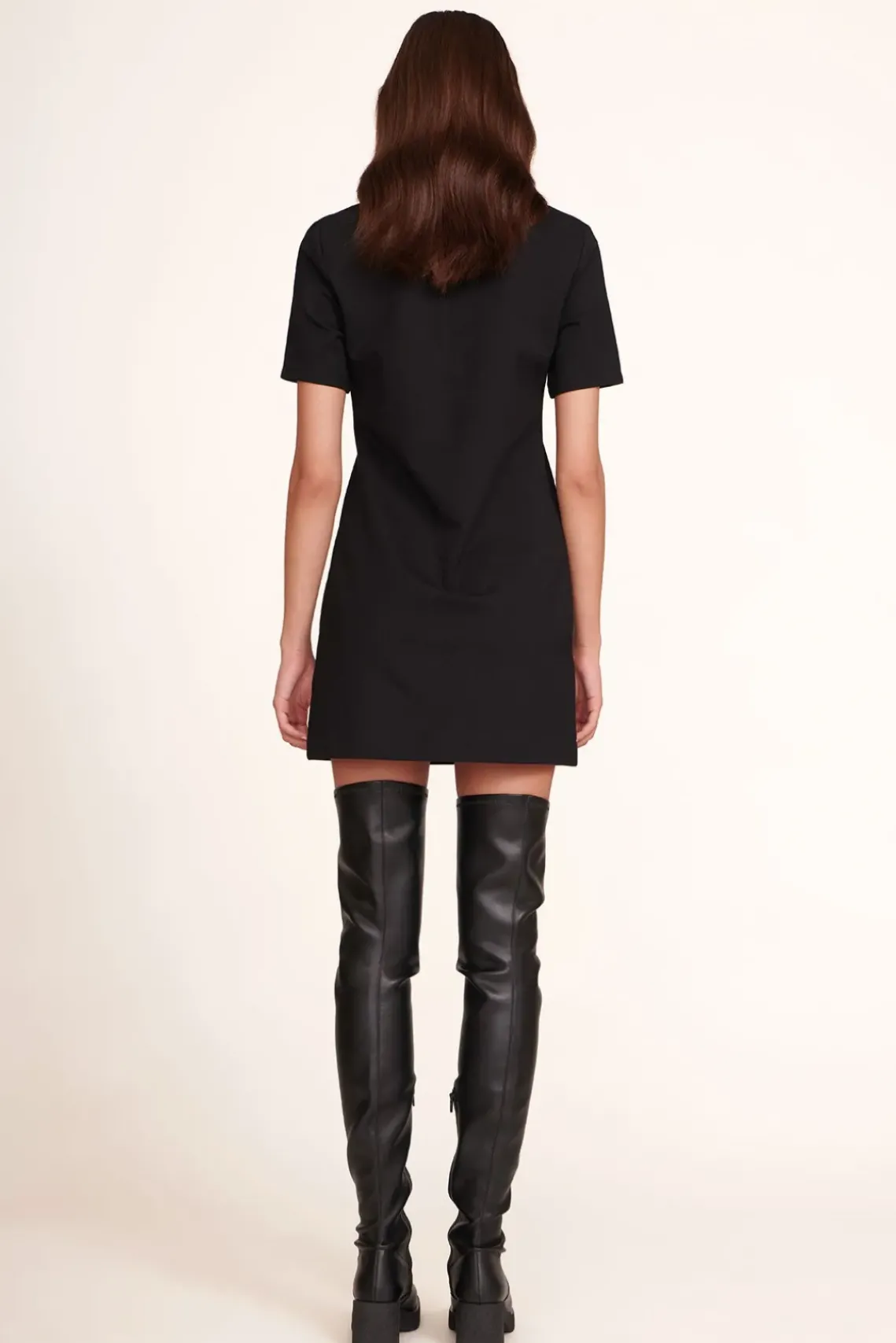The Jay Dress is an easy short-sleeved mini polo dress with a vegan leather collar and placket detail.