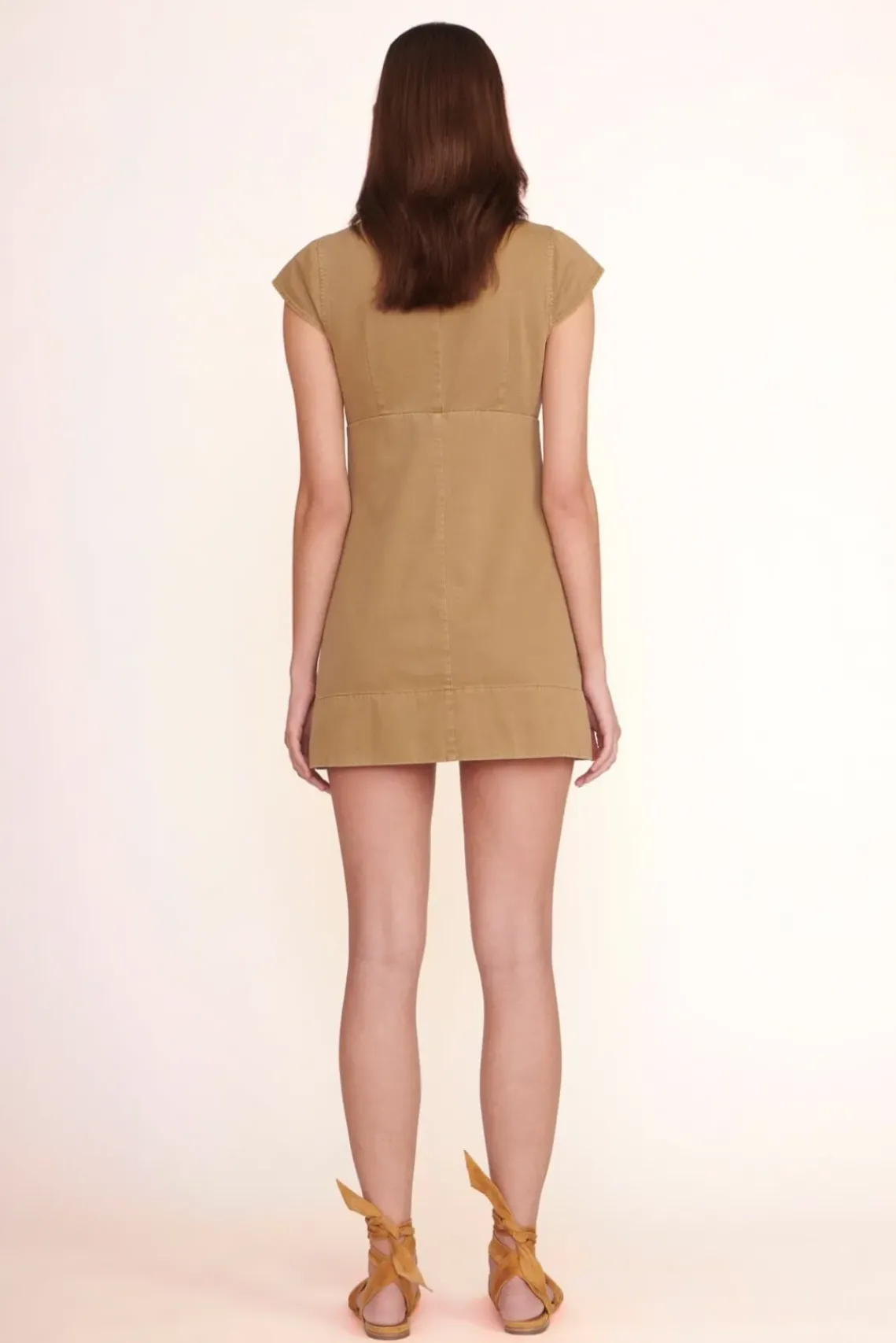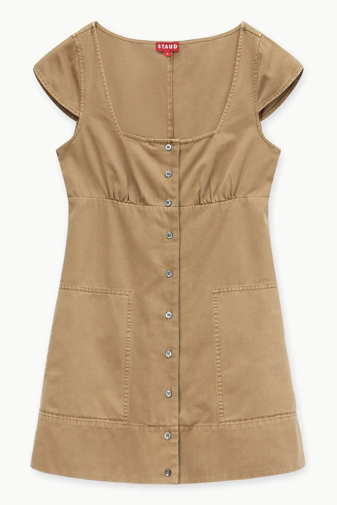 A babydoll mini dress with cap sleeves. The Julia Dress features a square neckline, front pockets and a button placket.