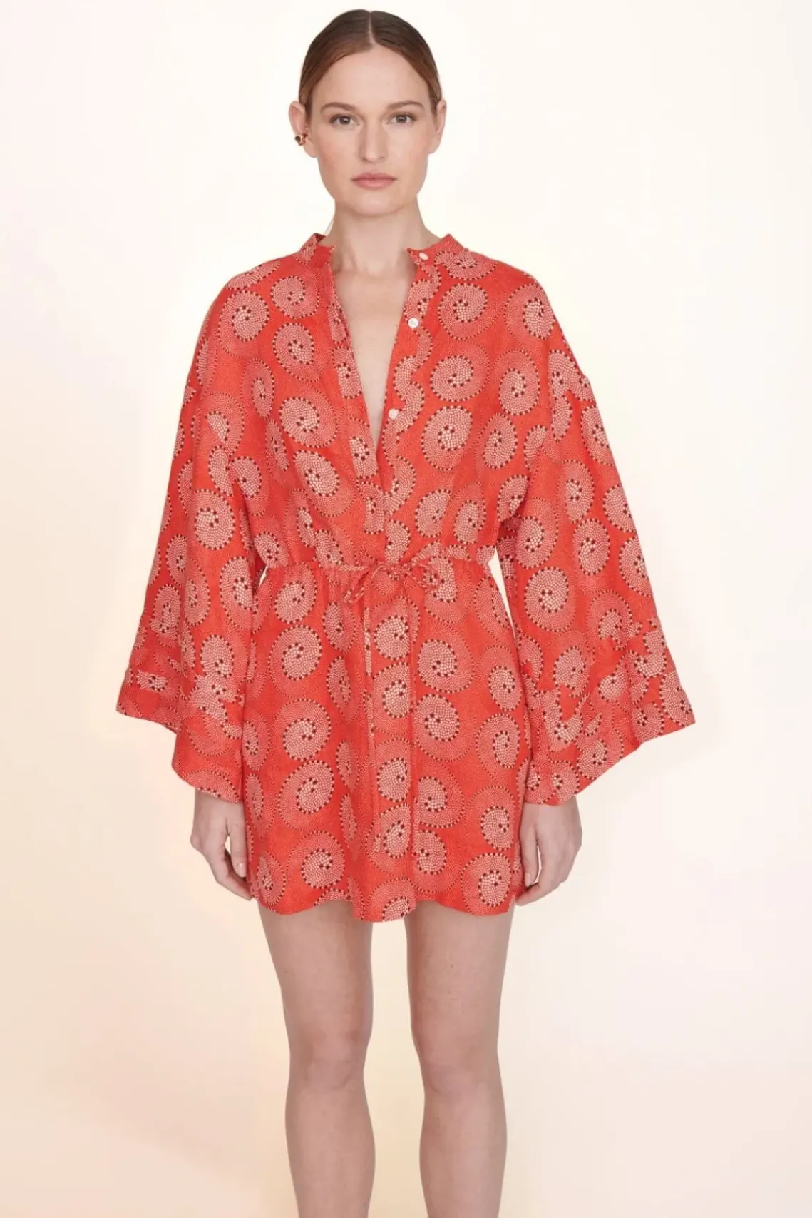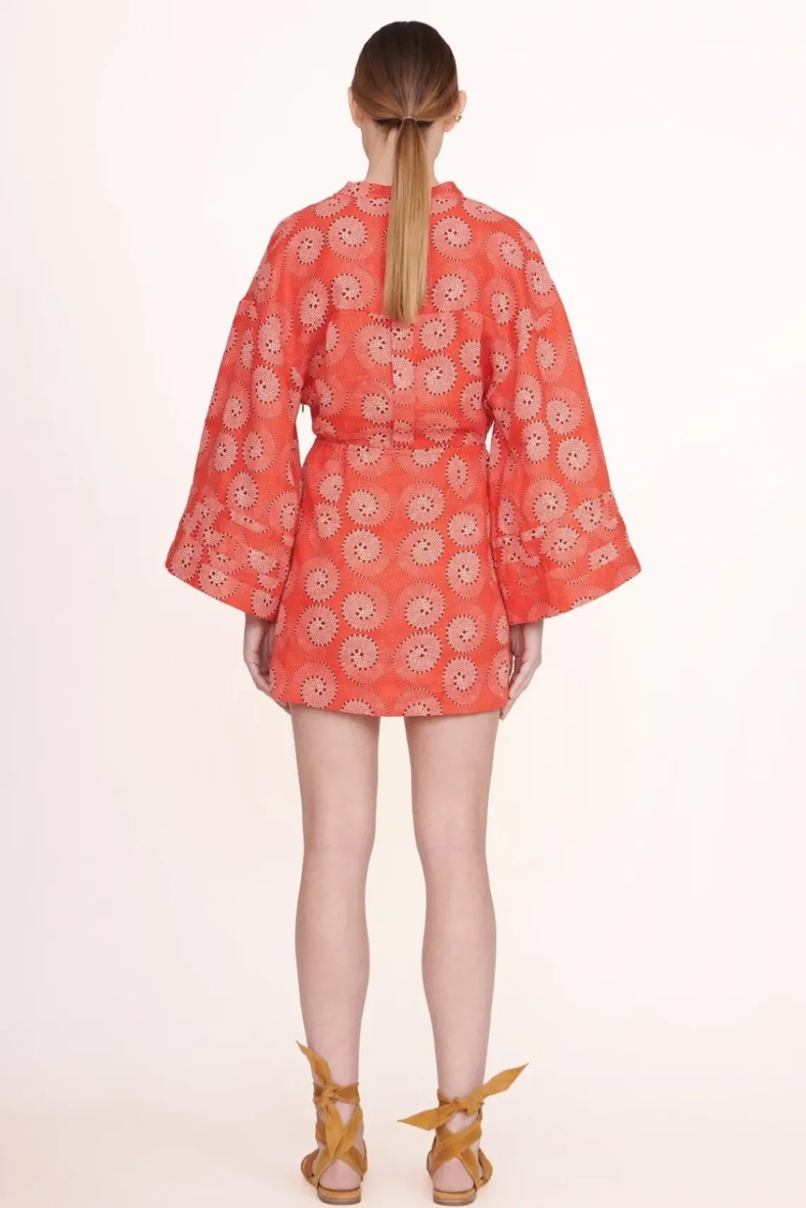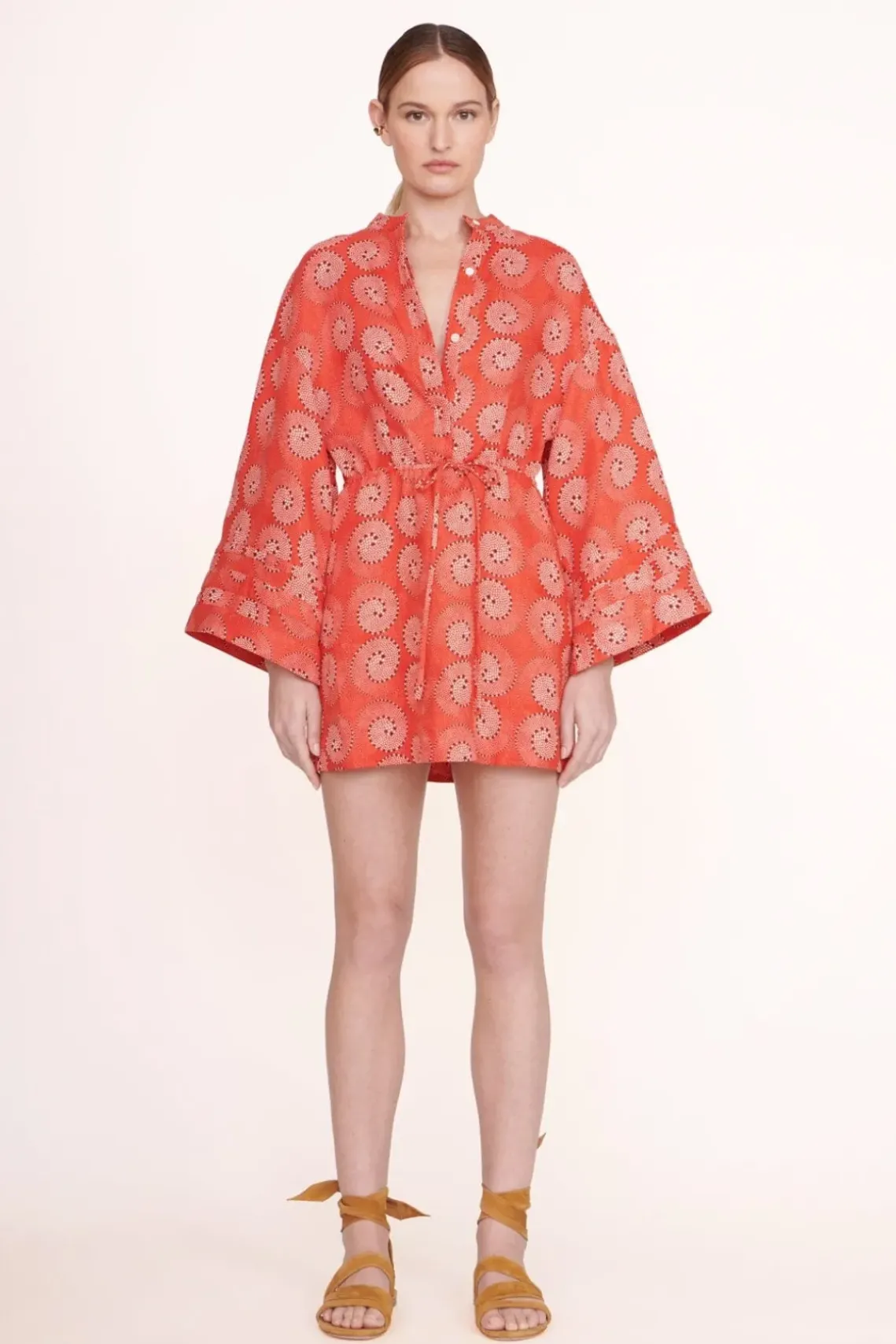 A linen mini dress, the Karlee Dress features bell sleeves and a waist tie detail.