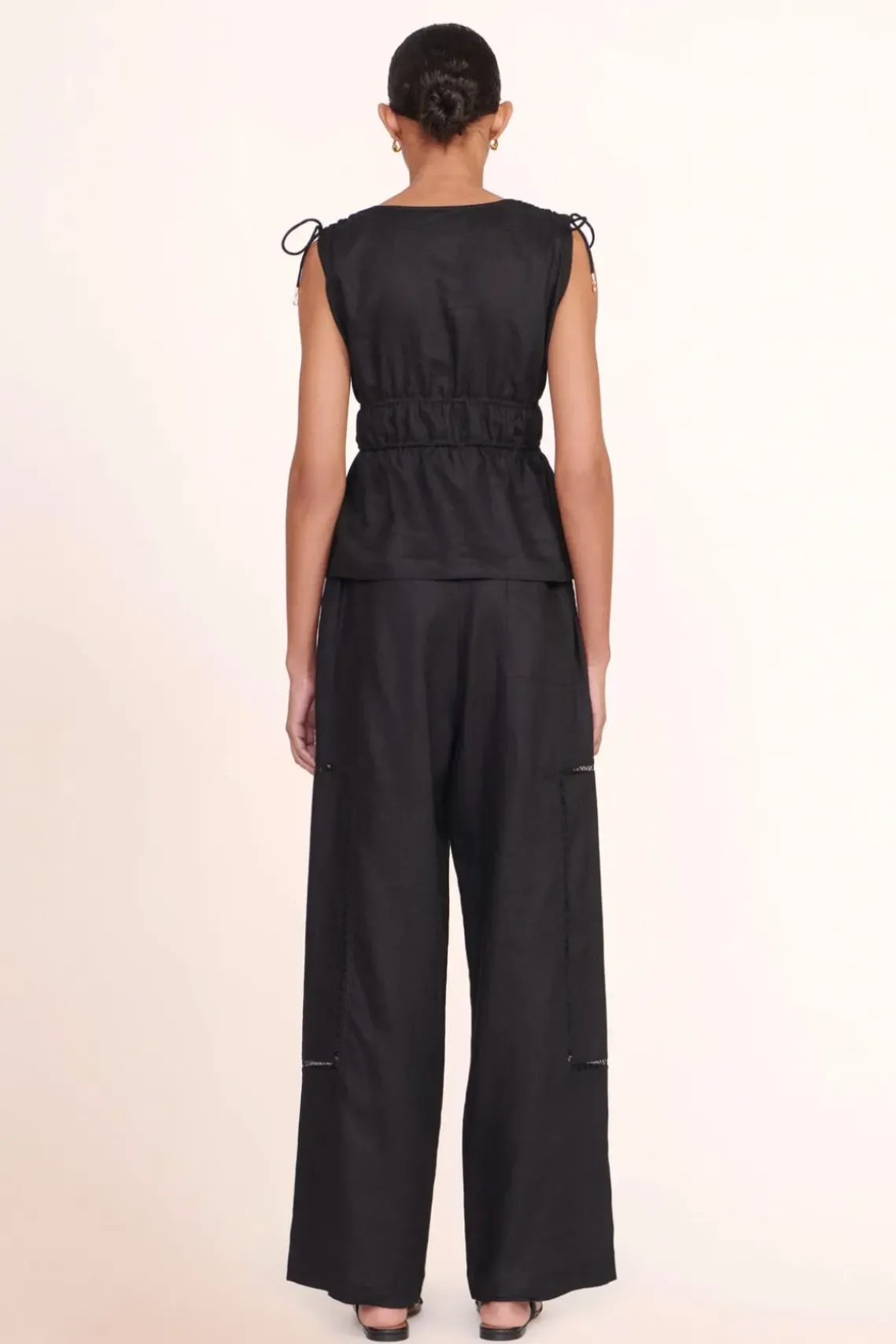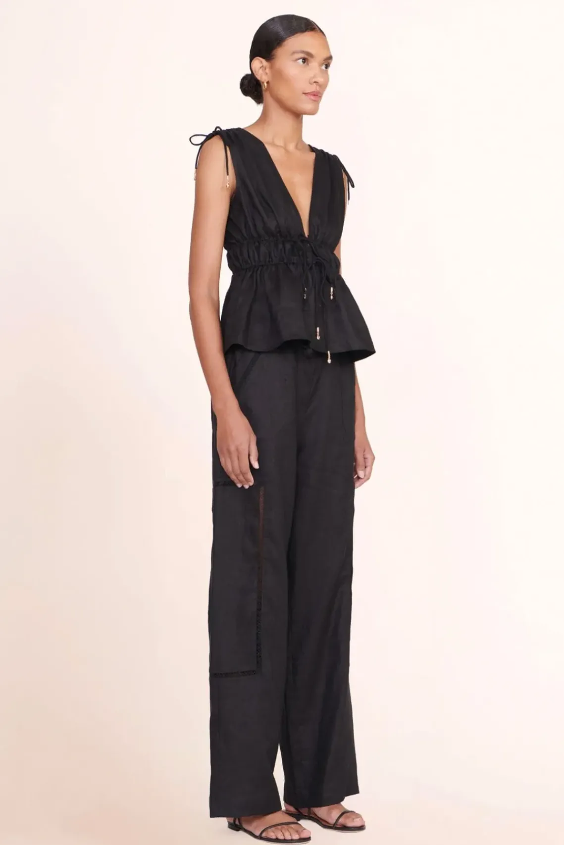 A linen sleeveless top, the Kendra top features drawstring details and shoulders with gold shell aglets at tie ends.