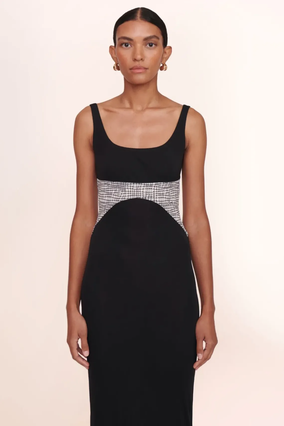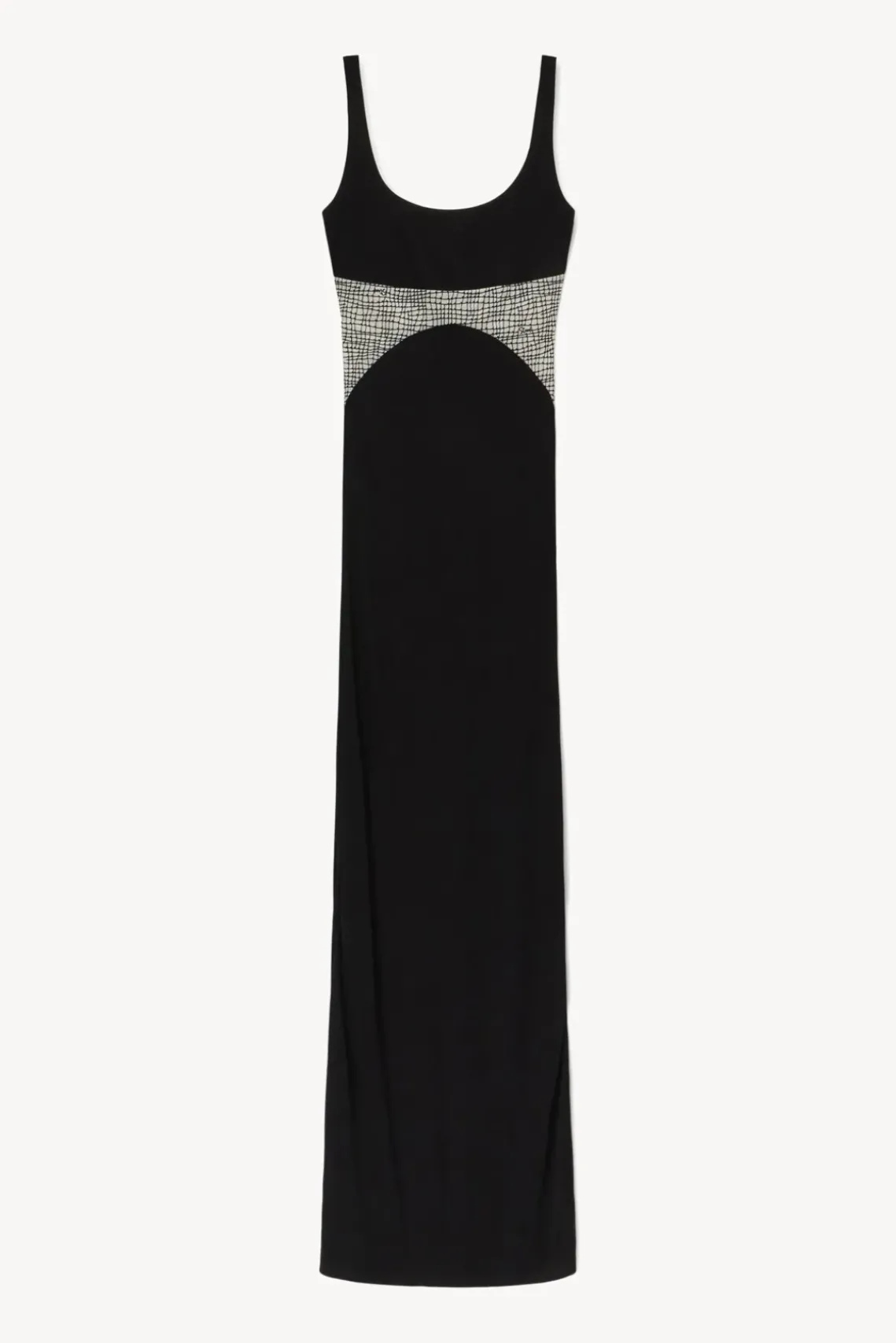 A stretch jersey maxi dress with wide neckline, the Laylani Dress features a contrast netting-printed mesh panel.