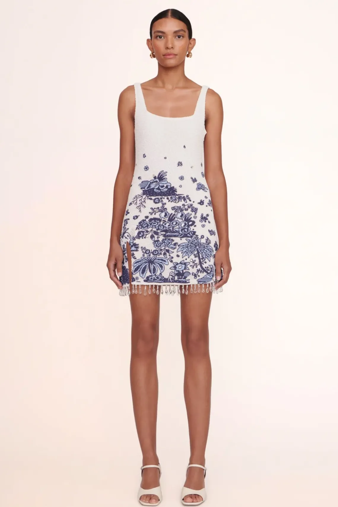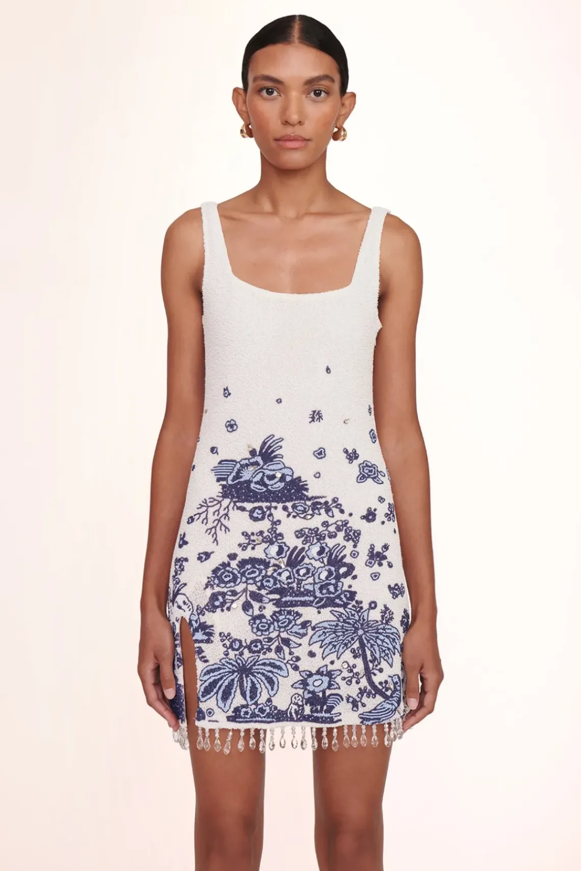 A square-neck beaded mini dress, the Le Sable Dress features a side slit and hanging crystal fringe at the hem.
