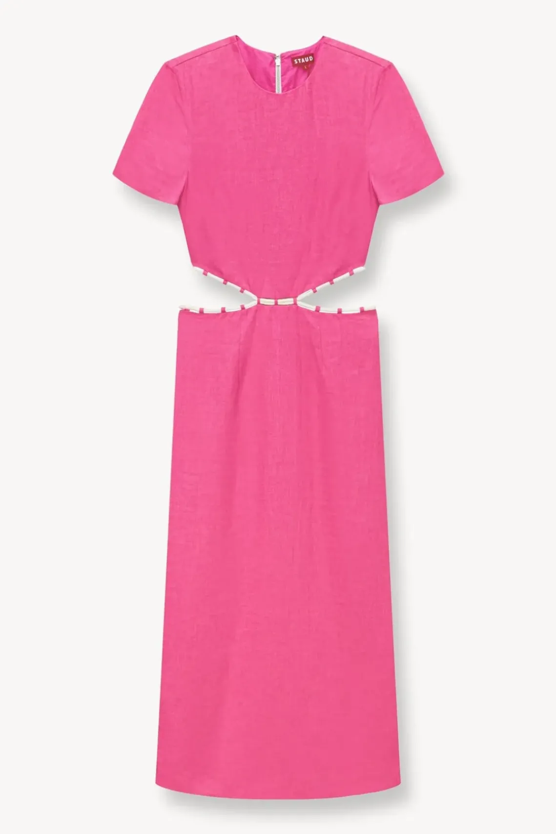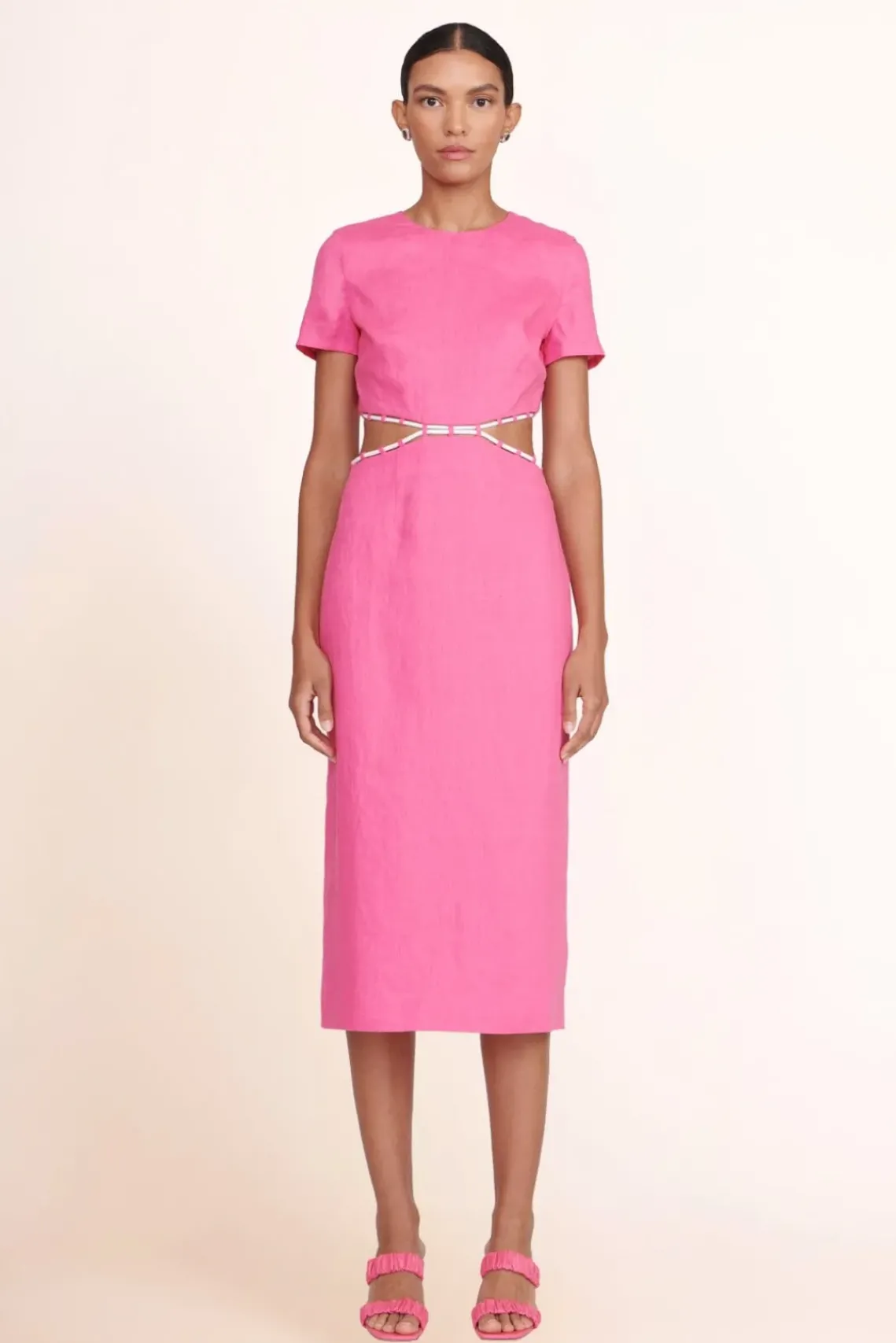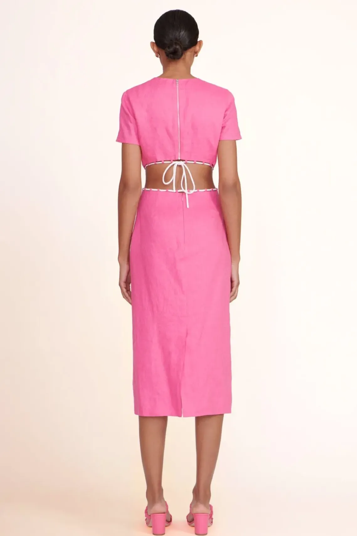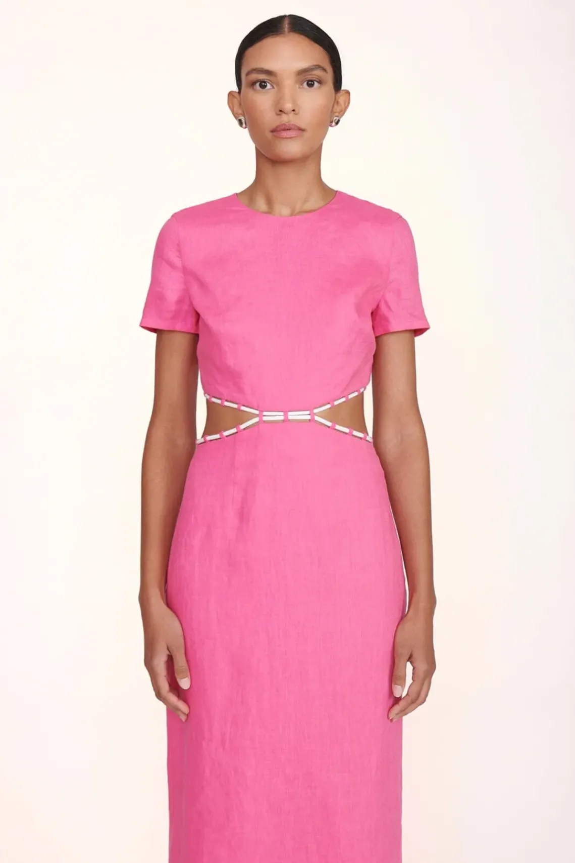 The Matteo Dress is a midi-length short sleeve dress constructed out of linen fabric. This style features side waist cutouts and a natural rope lacing trim detail.