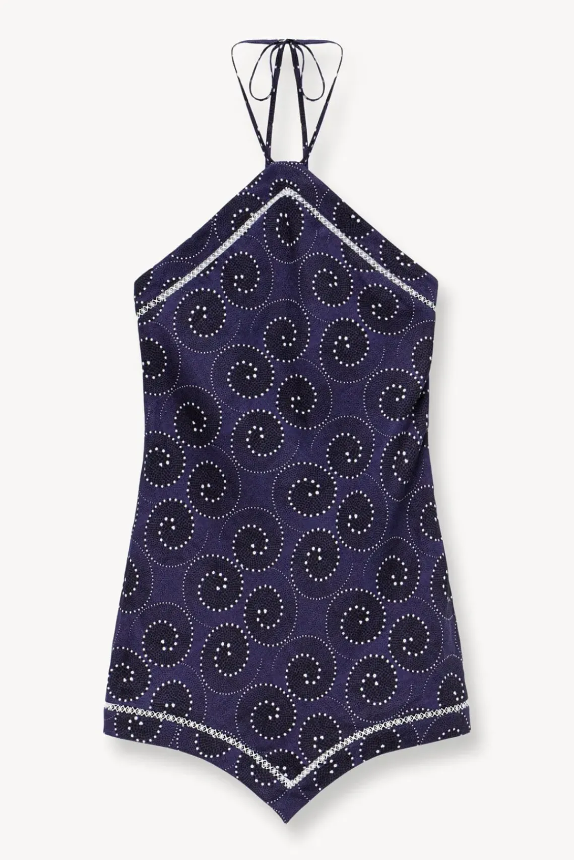 A linen halter dress, The Megan Dress features a pointed hem and lace trim.