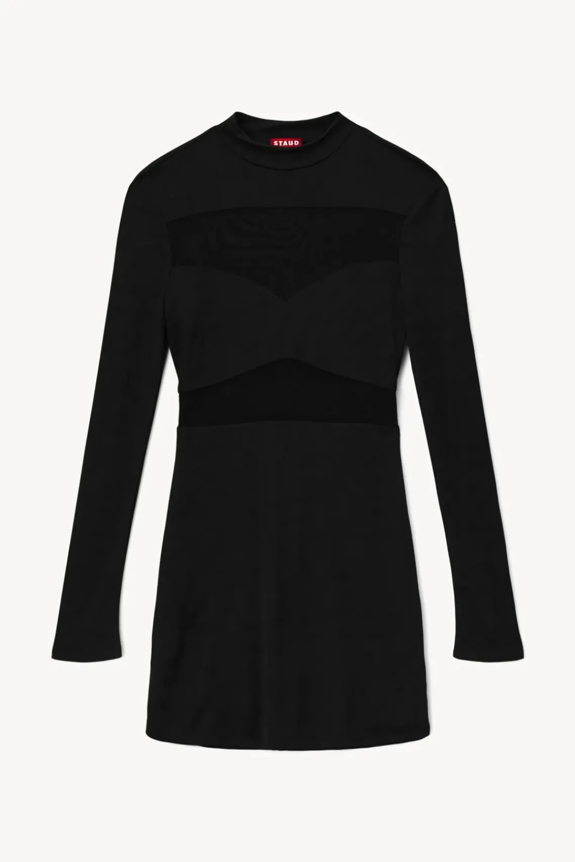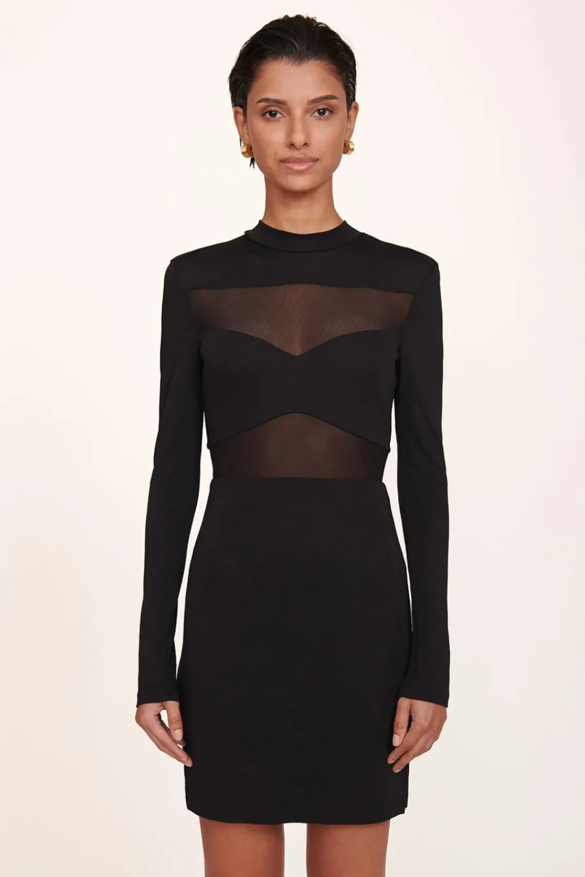 A mini stretch jersey dress with sheer mesh inserts, the Mini Falcon Dress features a mock neck collar and long sleeves.