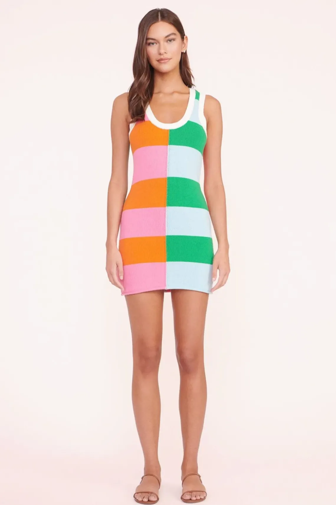 The Mini Seashore Dress is a sleeveless, mini-length knit dress with a v neckline. This style features a two-tone, contrasting stripe pattern and contrast trim.