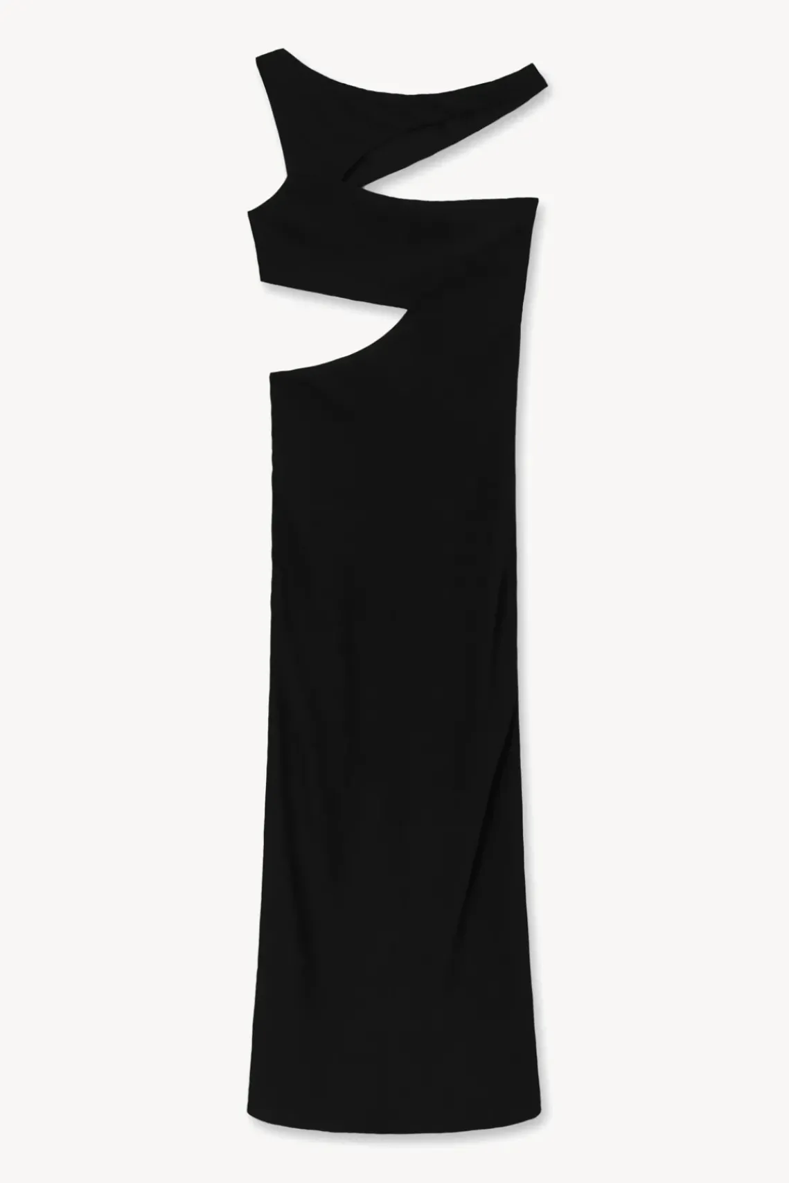 An asymmetrical, off shoulder dress. The Prismatic Dress is constructed out of a plisse fabric and features angular cutouts.