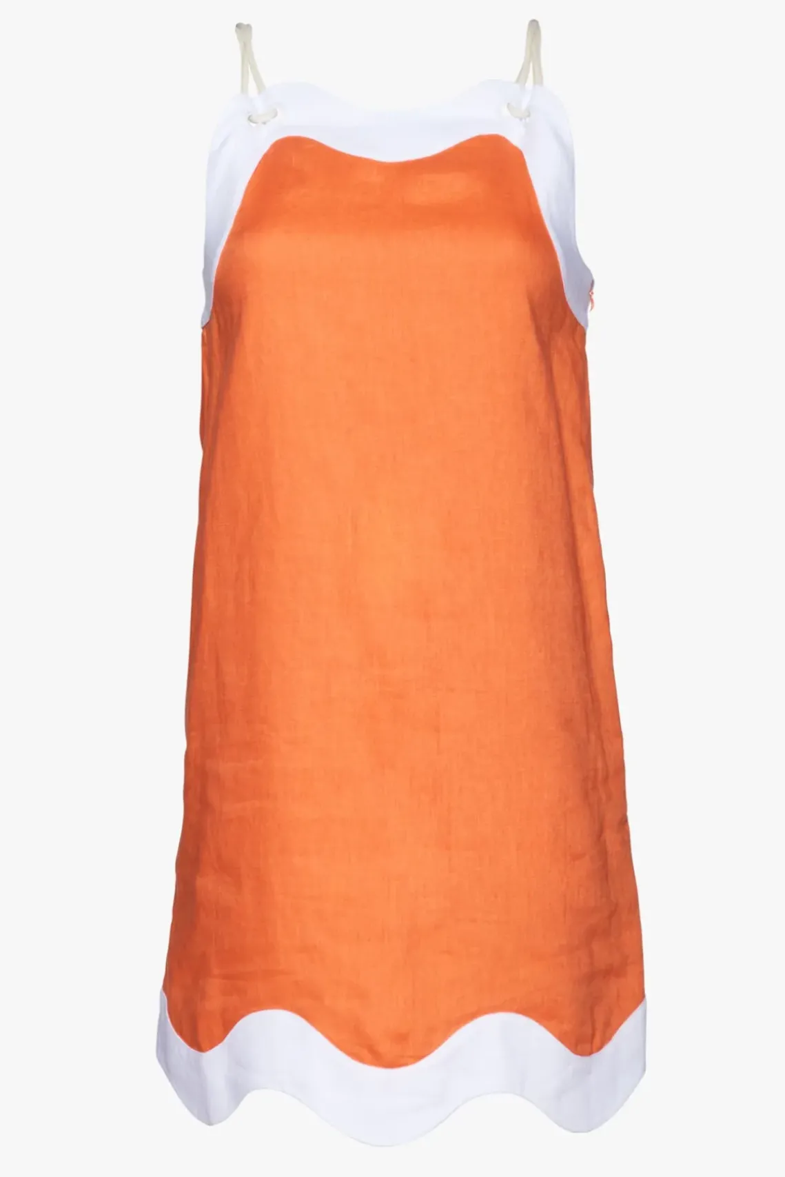 A sleeveless linen trapeze dress, the Renata Dress features contrast wiggle detail and natural rope straps.