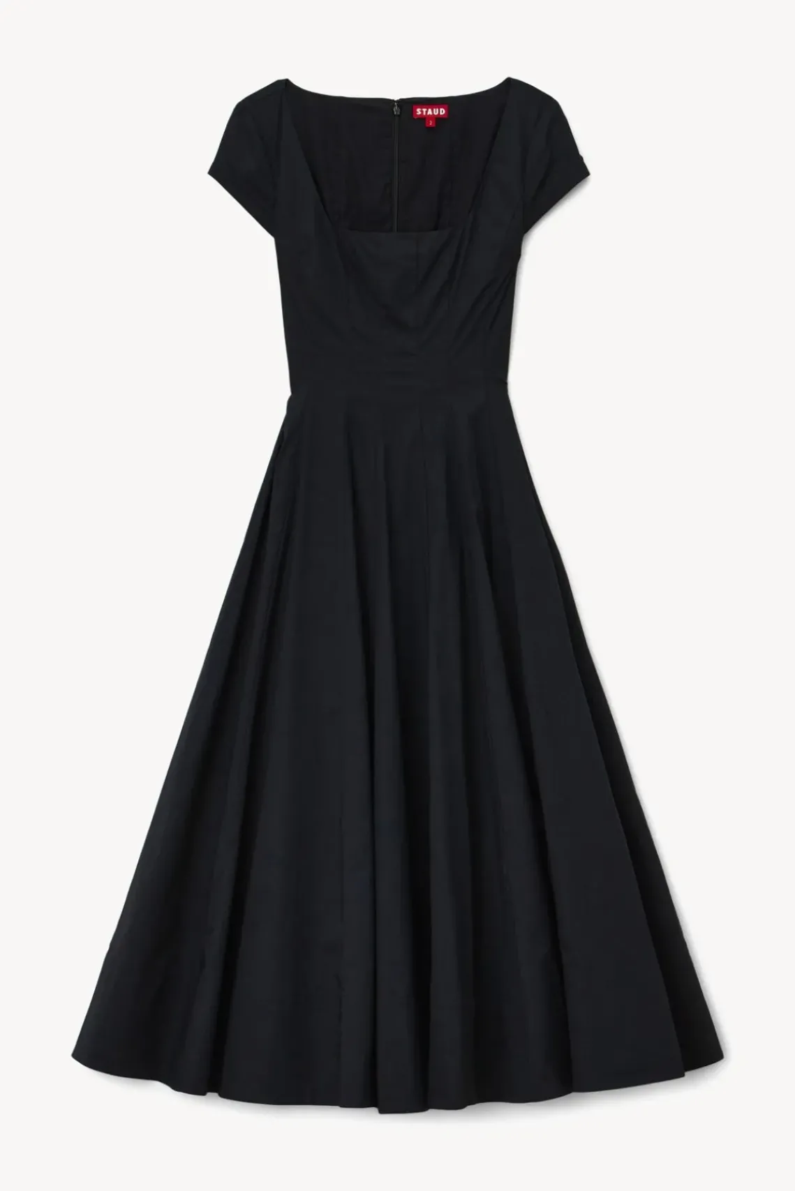 Our classic midi poplin dress in a short sleeve update. This style is fashioned after the STAUD signature Wells Dress and features the same corset-style panel construction and a-line skirt.