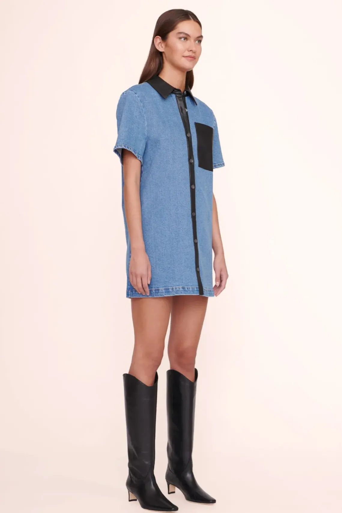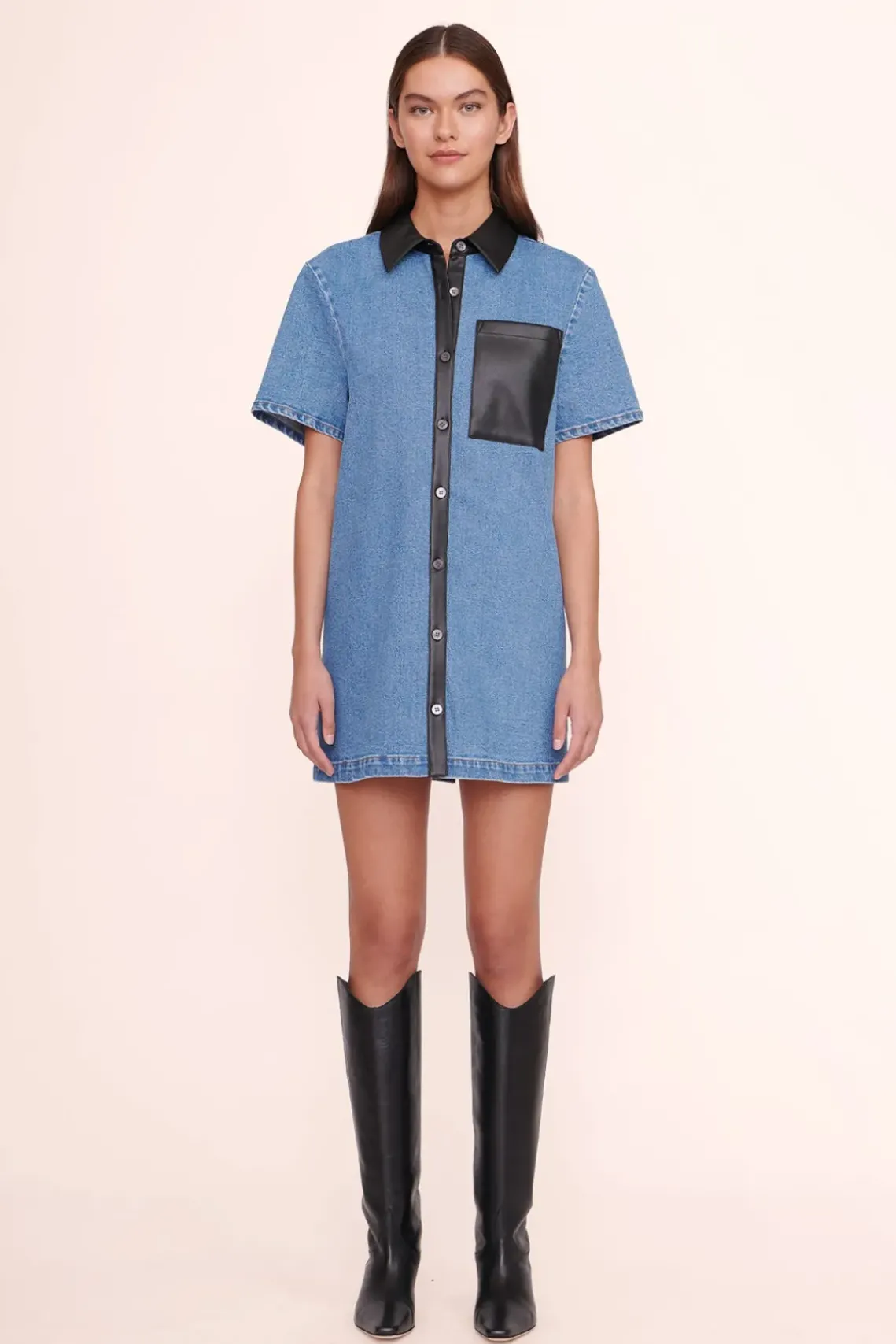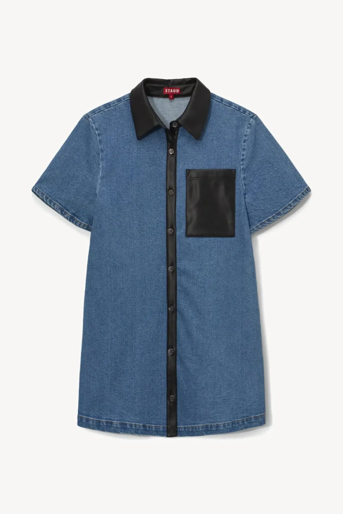 The Switch Dress is a medium wash denim button-down shirt dress featuring vegan leather trim detail.