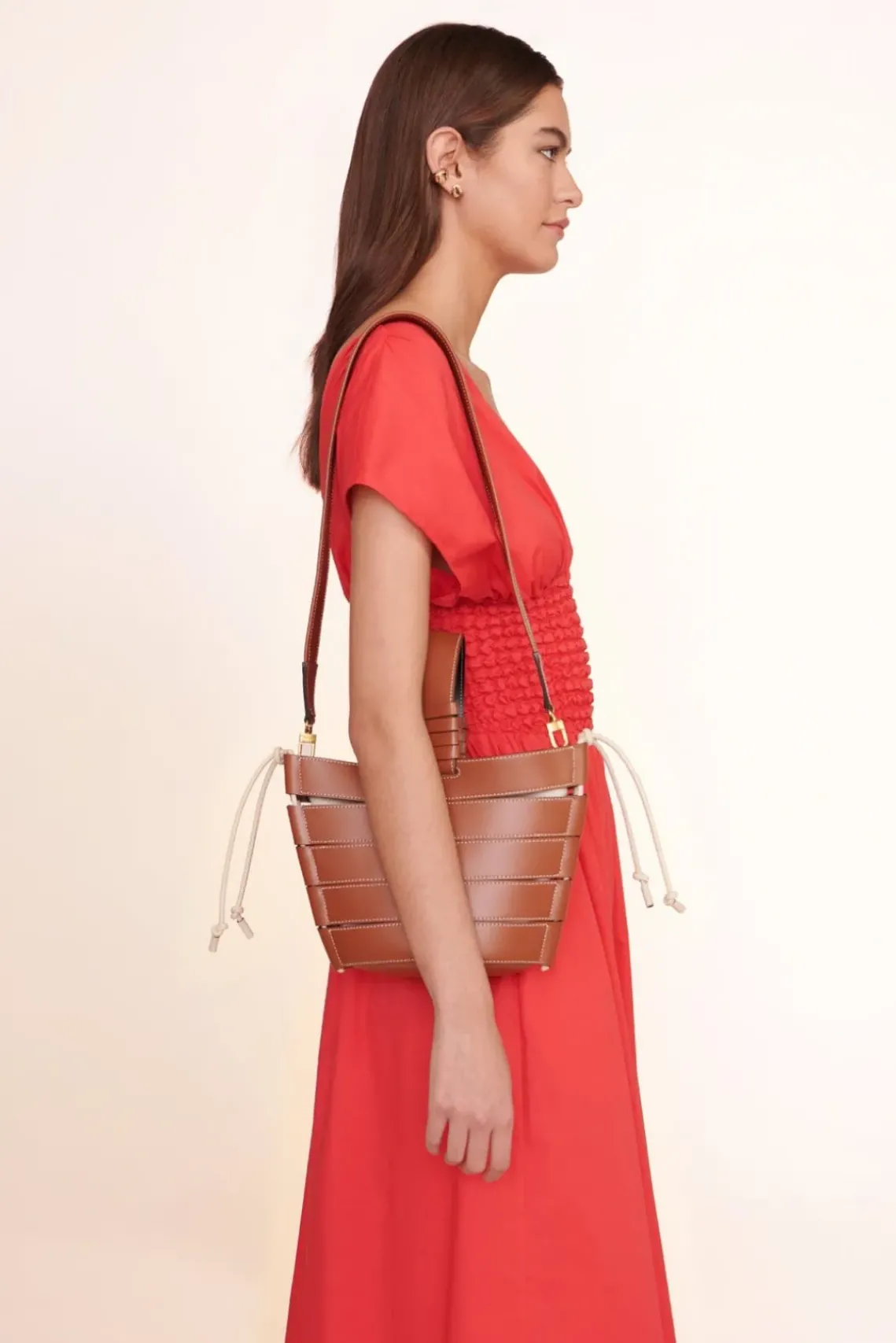The Mini Diamond Tote features a slatted leather construction with natural cotton decorative cords and a removable canvas drawstring pouch with interior pocket.