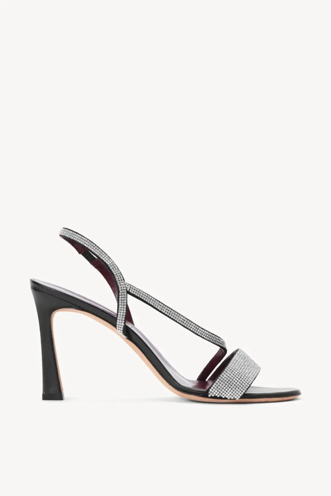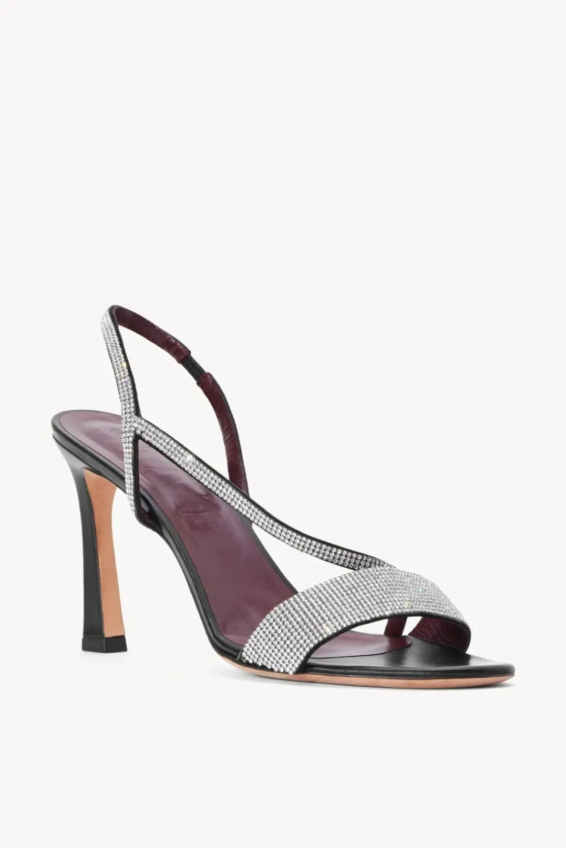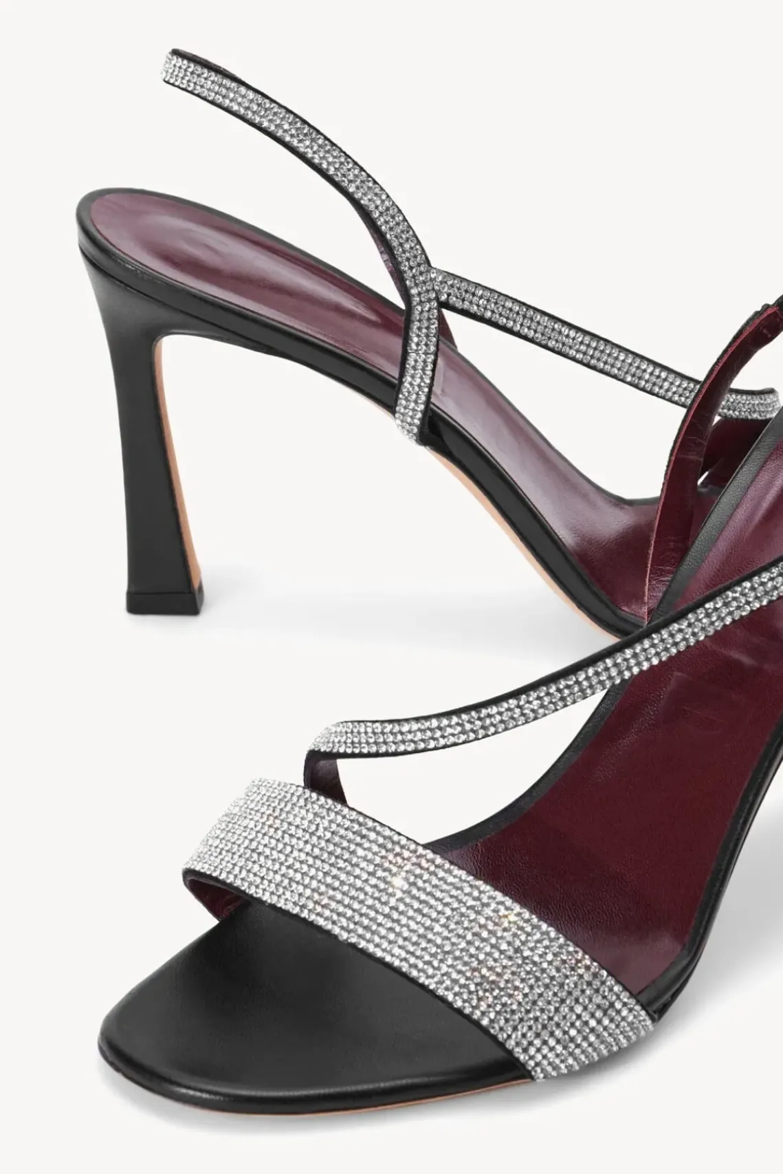 An open toe slingback stiletto with cross over strap, the Rhinestone Nadja Heel features a sparkly upper and leather sole.