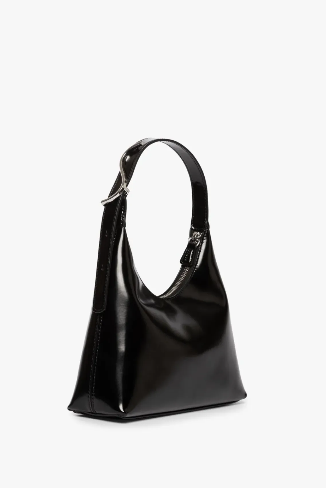 The Scotty Bag is a triangular shaped leather bag featuring adjustable top handle, zipper closure, S logo, and silver hardware. Made out of polished leather.