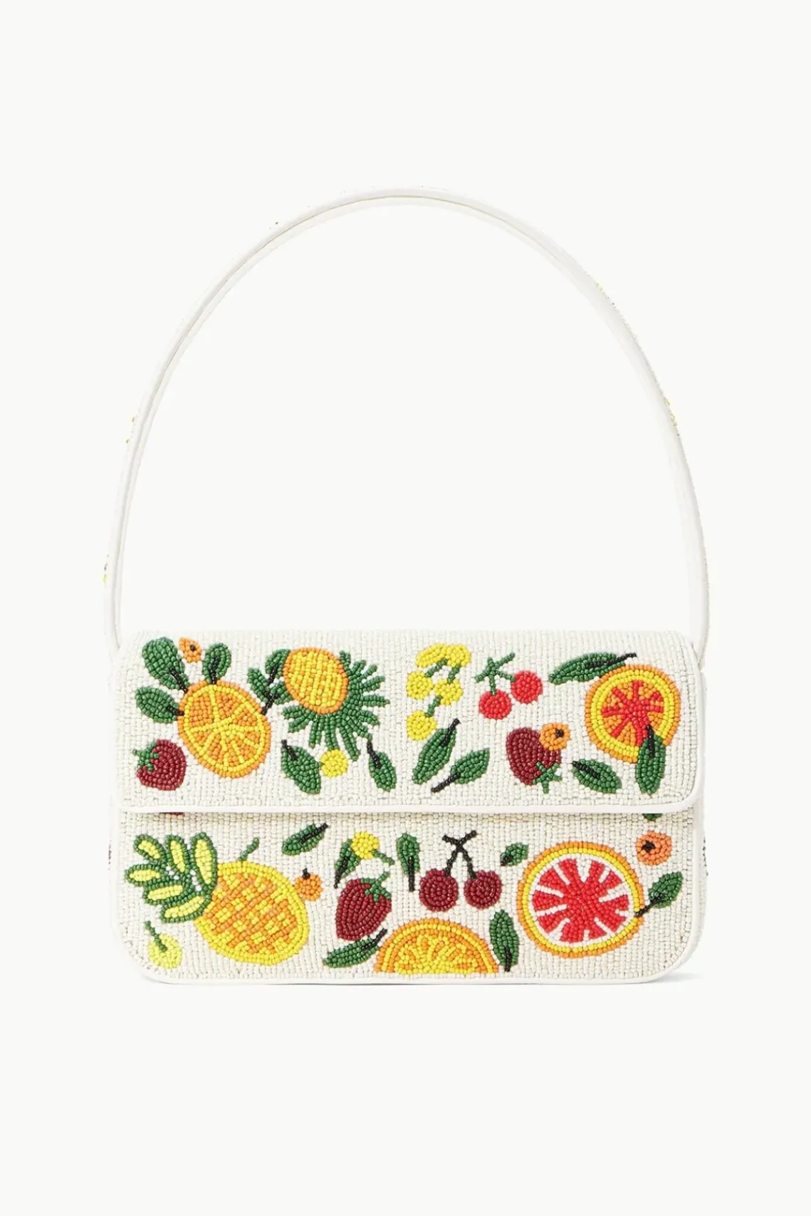 The classic hand-beaded shoulder bag with vegan leather piping. This Tommy update features an all over fruit pattern and magnetic snap closure.
