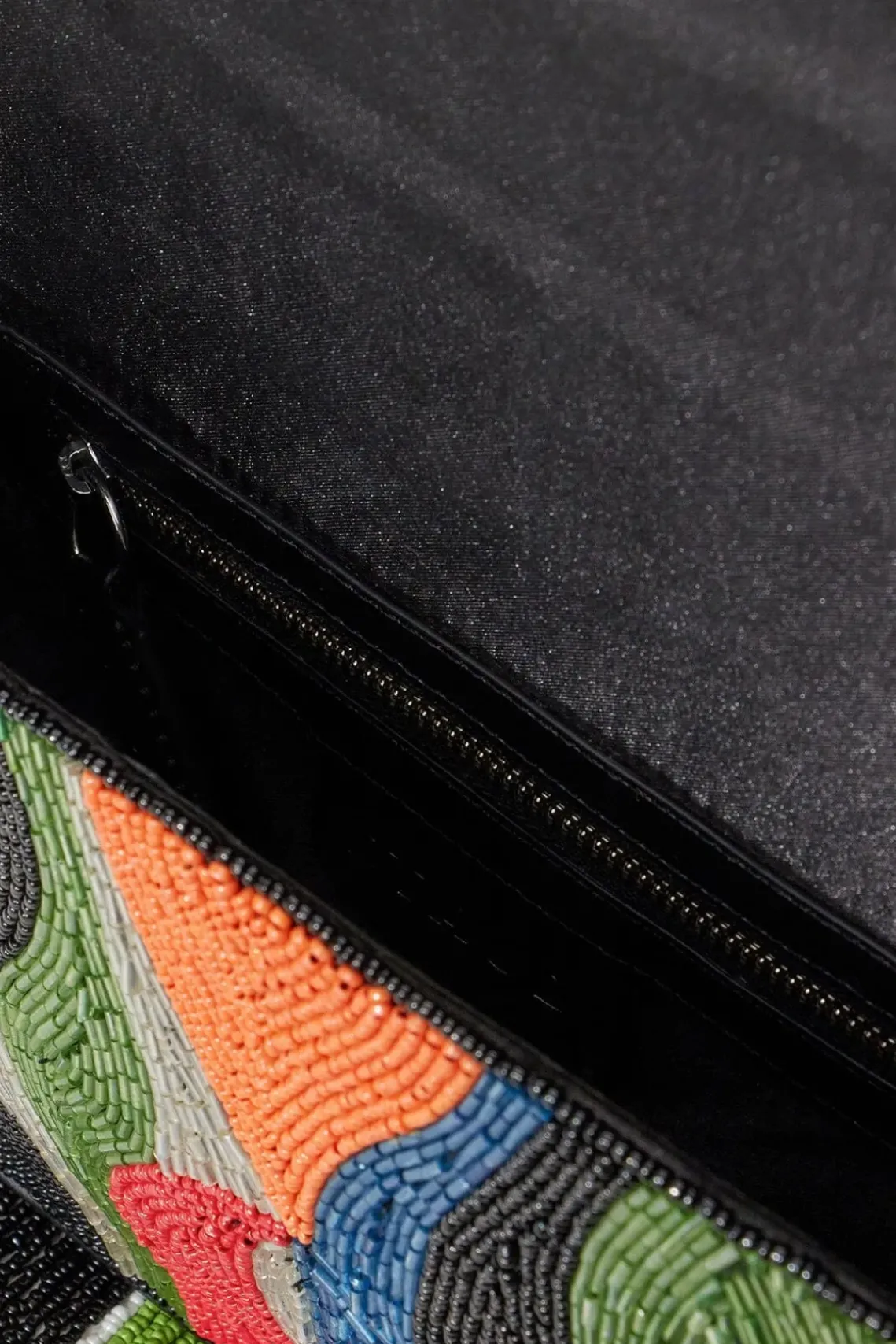 The classic hand-beaded shoulder bag with vegan leather piping and bottom fringe. This Tommy update features a colorful abstract pattern and magnetic snap closure.