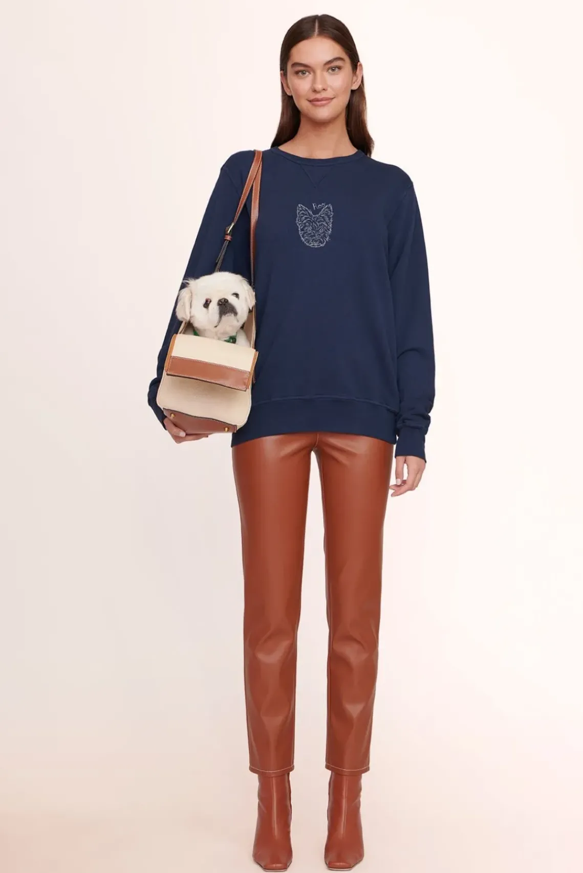 A pet carrier that doesnt compromise on style. Crafted from canvas and nappa leather this bag features a partial zip front, interior leash with clasp, and contrast top stitch detail. Dog Model Info: Mushu is a Pekingese and weighs 16 pounds.