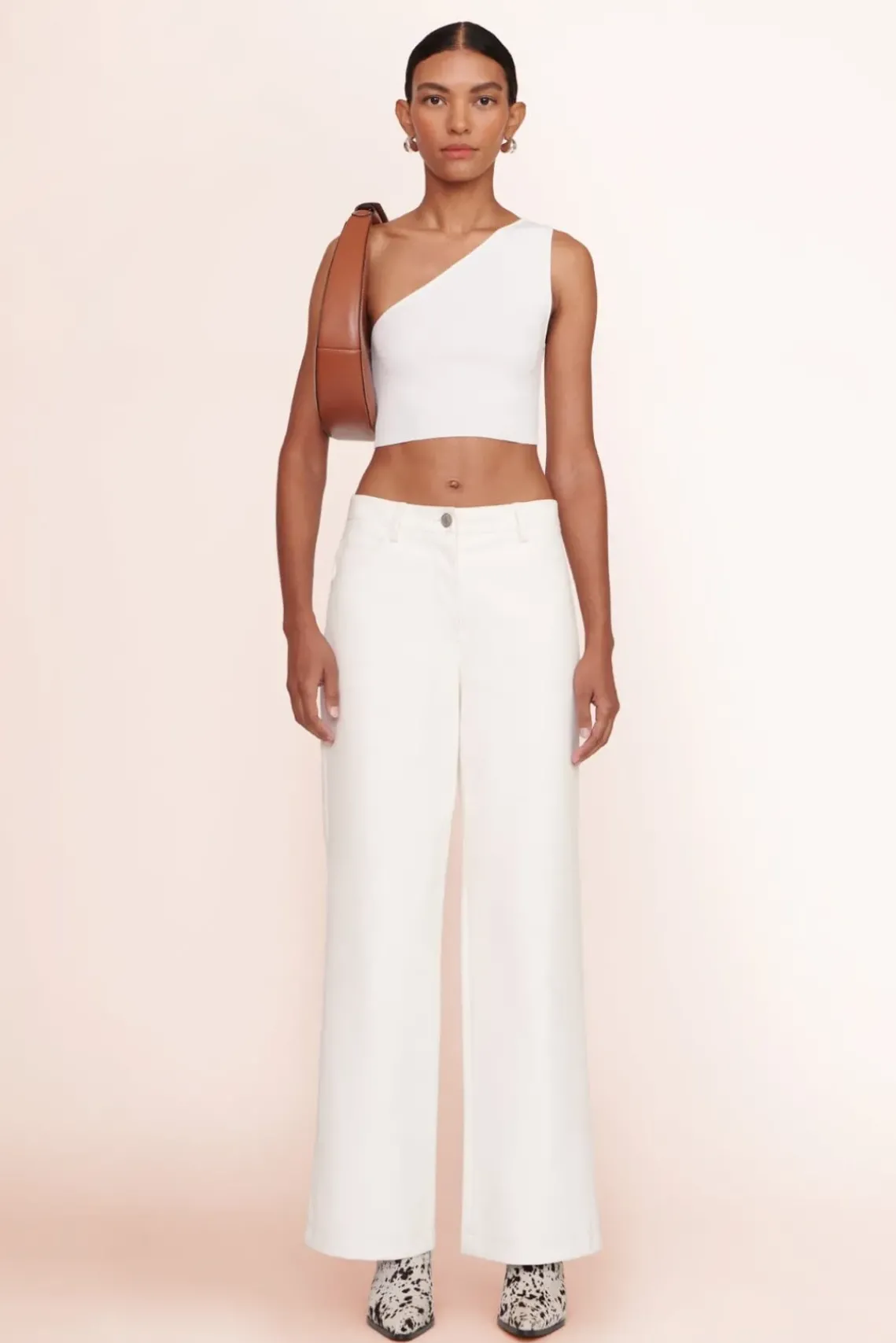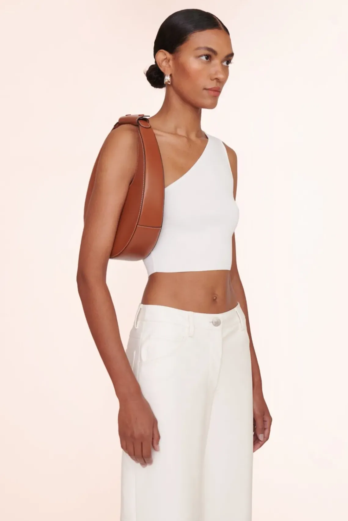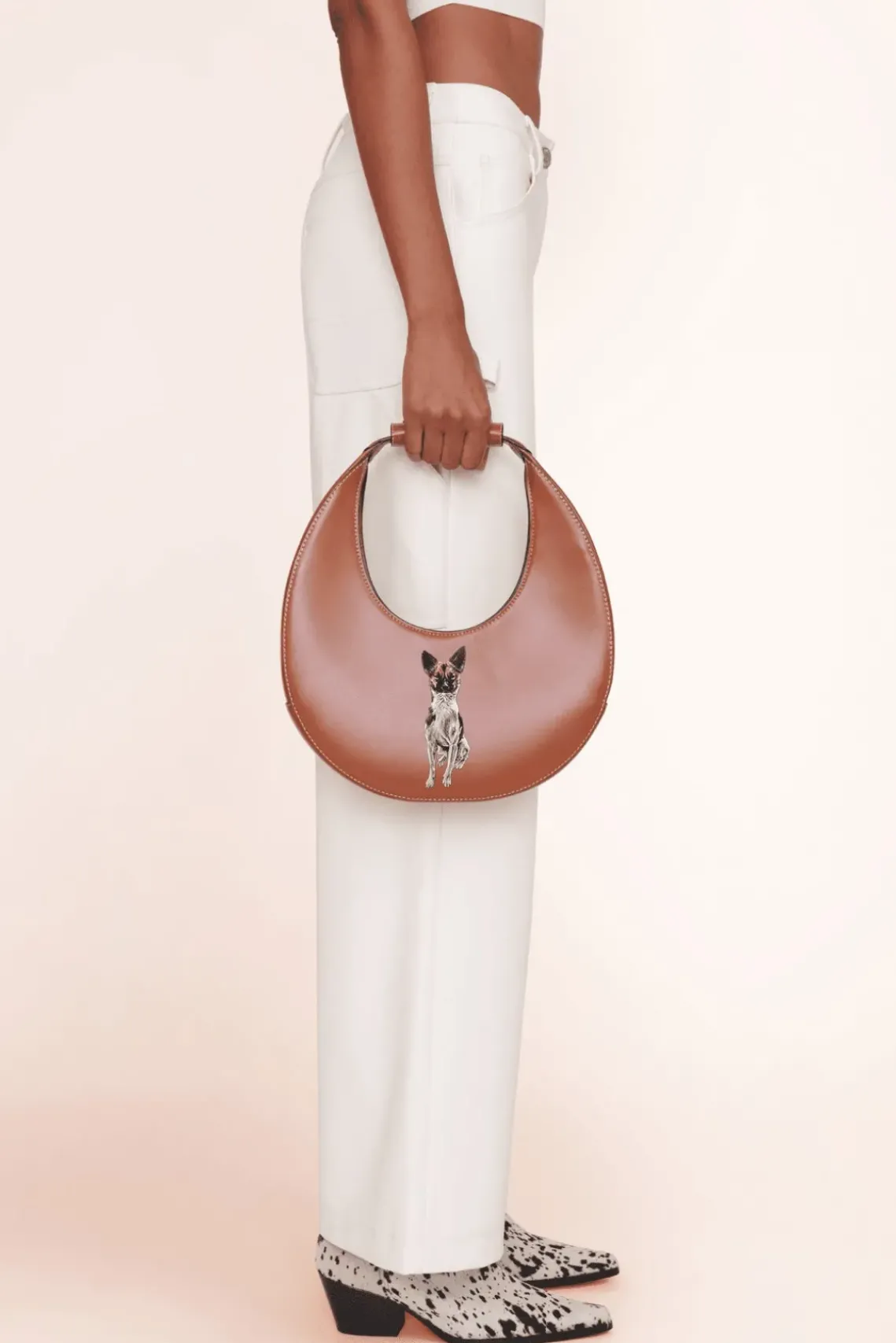 Please allow 5-8 weeks once your order has been placed for us to fulfill and ship. Personalize your handbag with a hand-painted portrait of your pet. The Moon Bag features a curved handle with a removable STAUD embossed accent. Designed in a crescent moon shape with inner suede lining and a magnetic clasp closure to ho