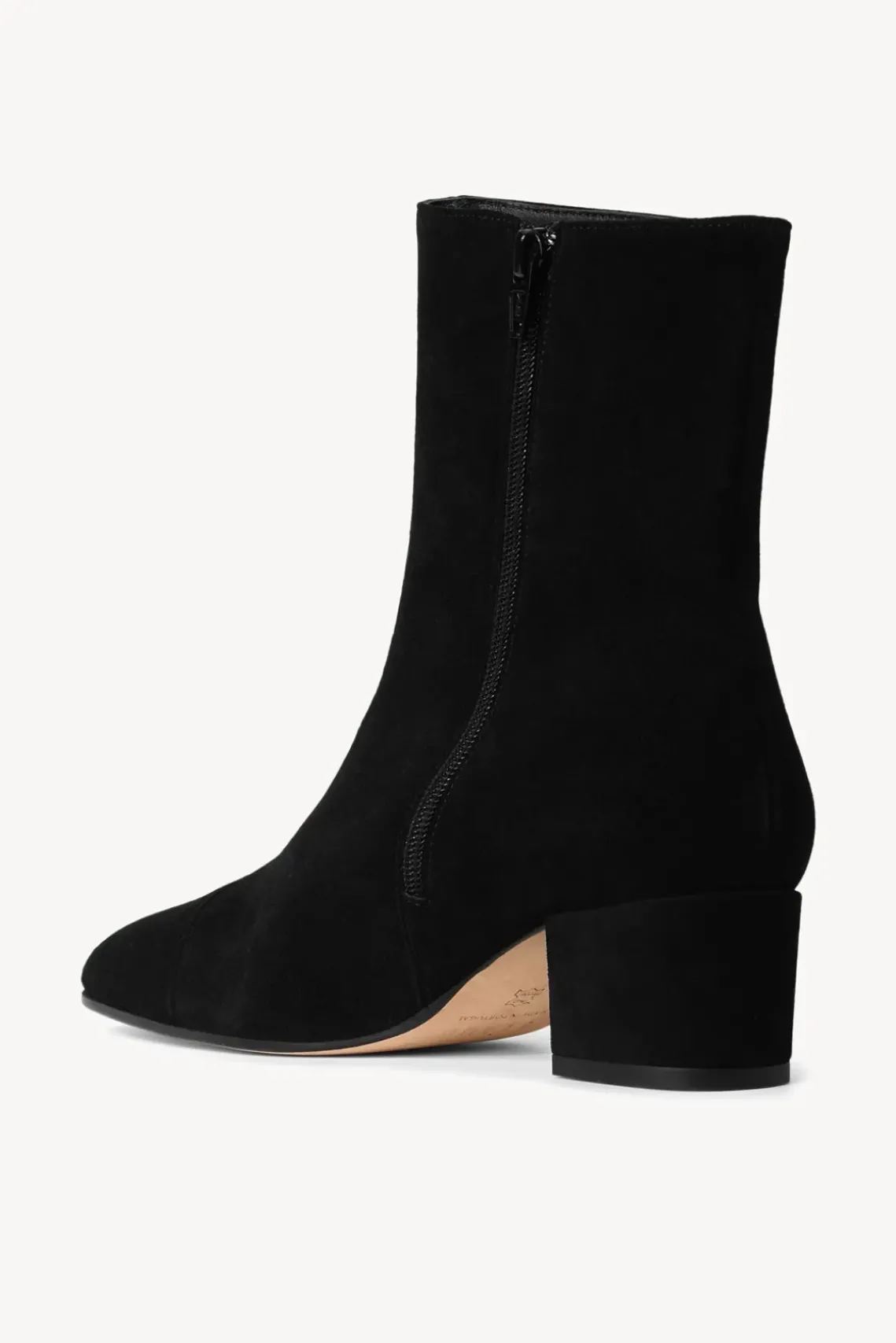 The Aimee is a round-toe suede ankle bootie featuring a block heel and side zipper.