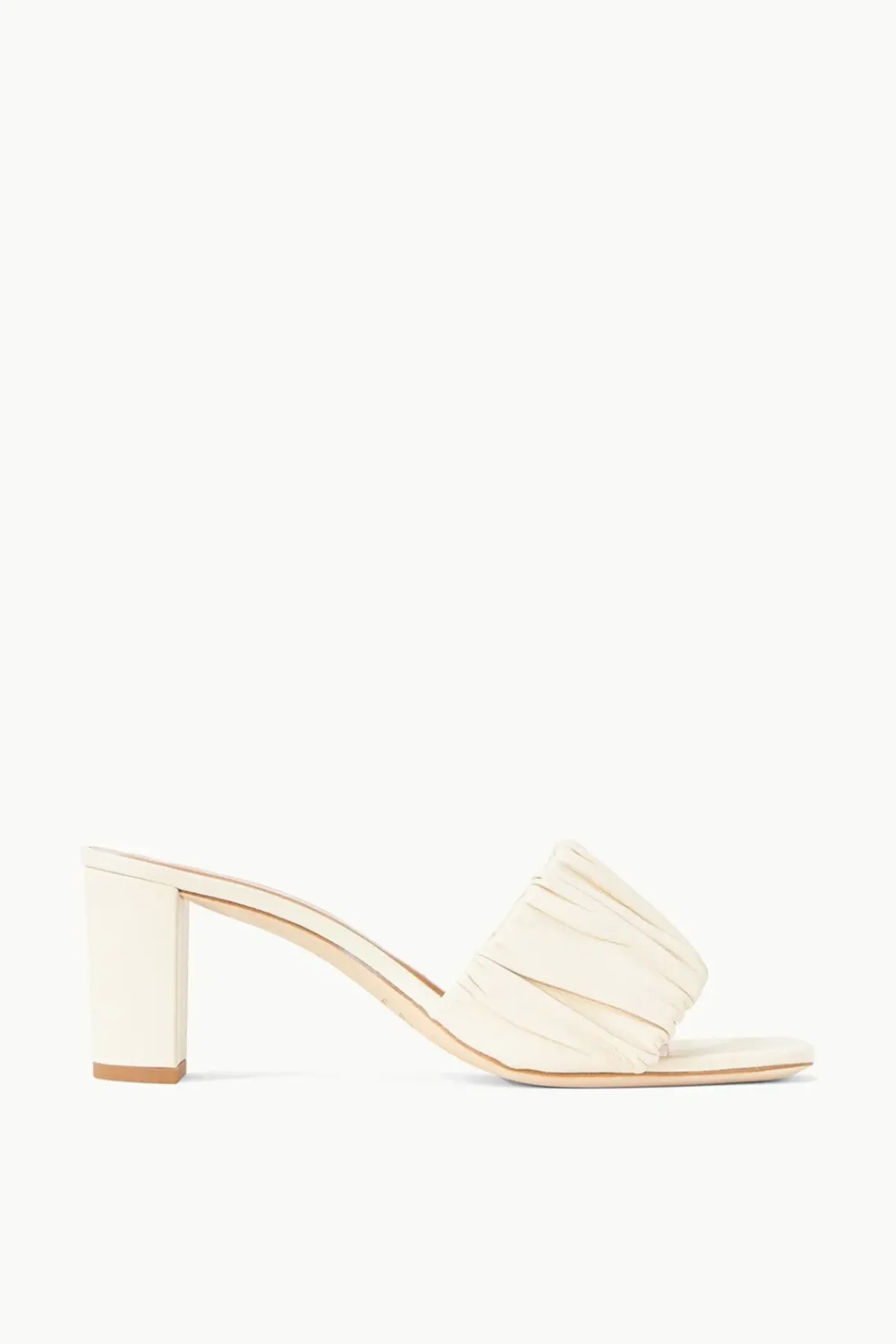 A soft nappa leather high-heeled sandal with ruched upper and square toe.