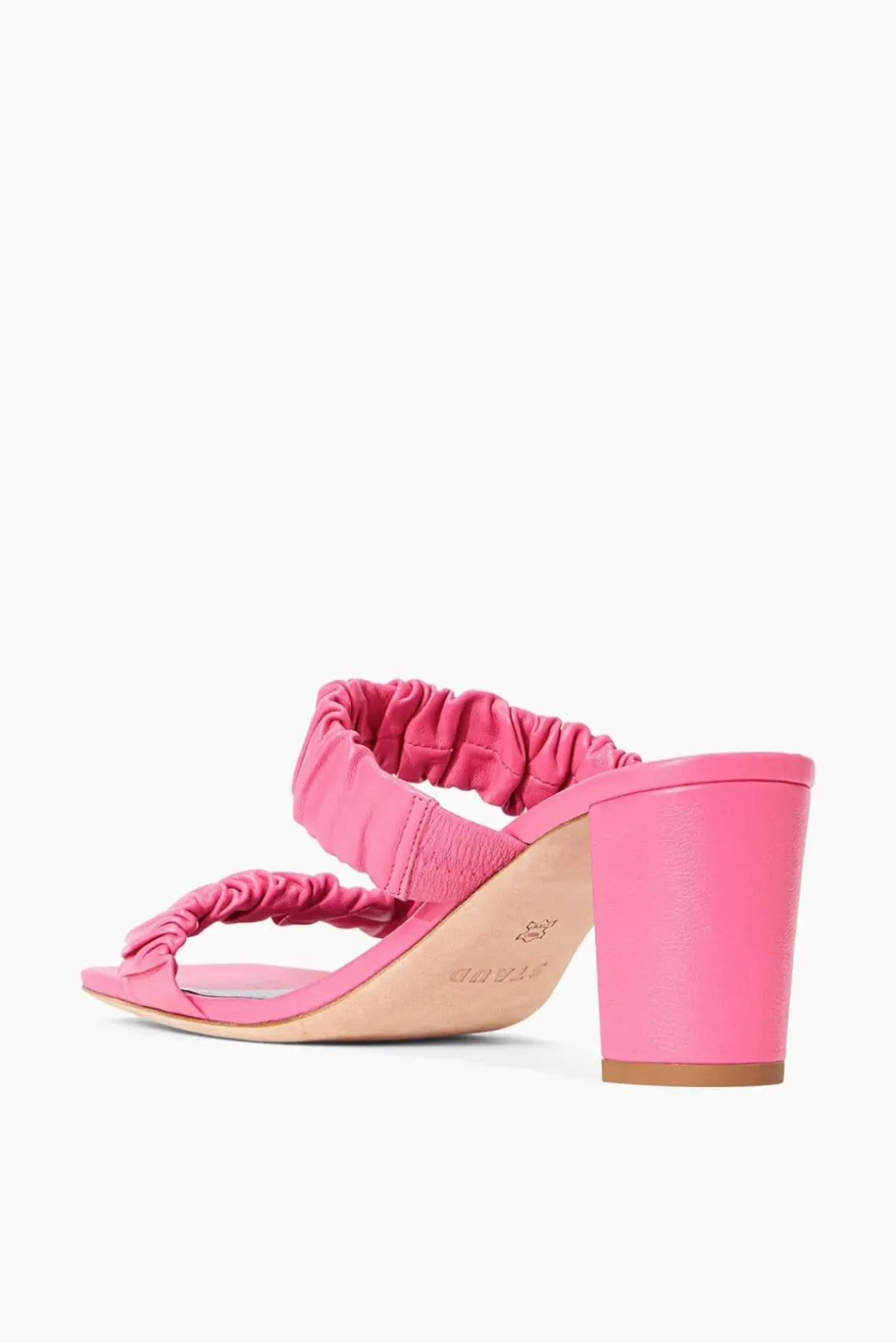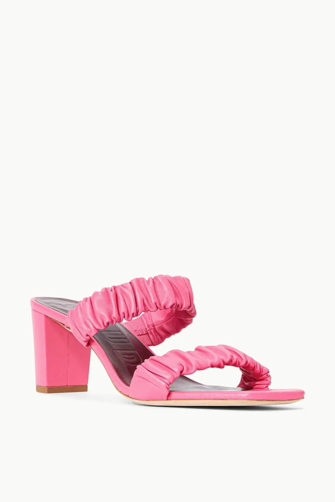 A ruched leather sandal, the Frankie features a square toe and block heel.